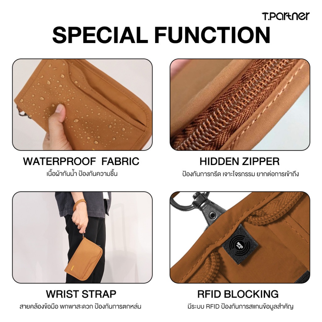 Tpartner RFIDsafe Passport Holder — กระเป๋าใส่พาสปอร์ต 8 ช่อง ป้องกันสัญญาณ กันโจรกรรม ผ้ากันน้ำ พร้อมสายคล้องมือ