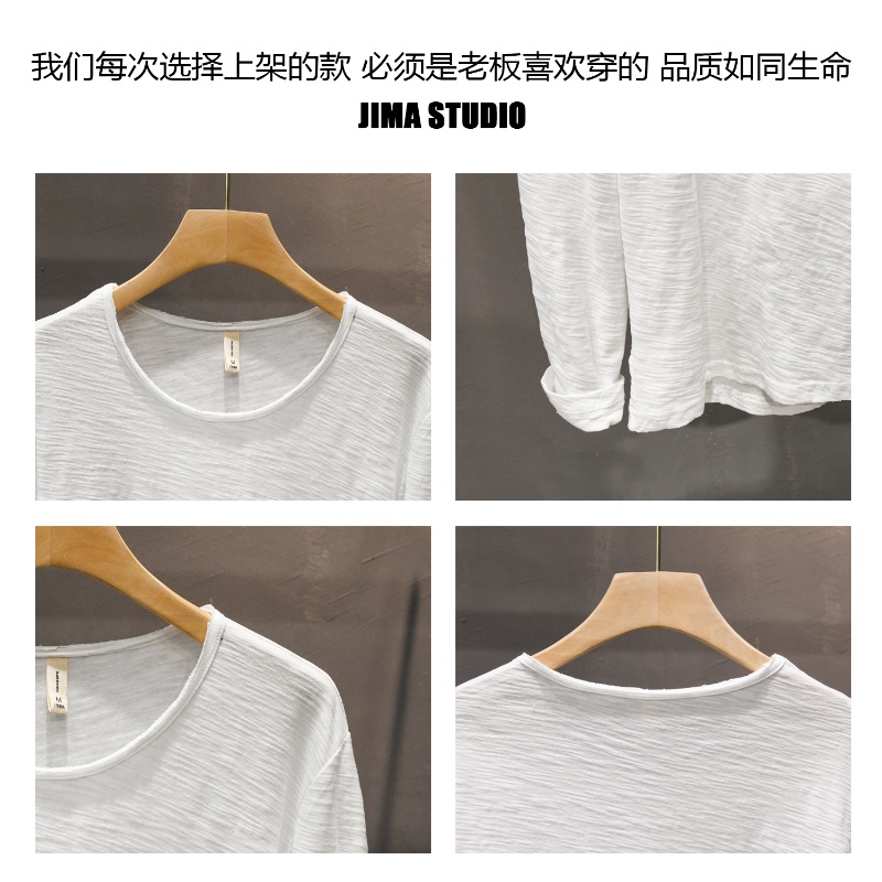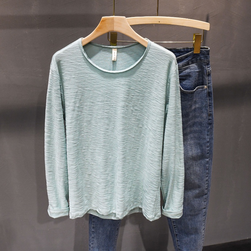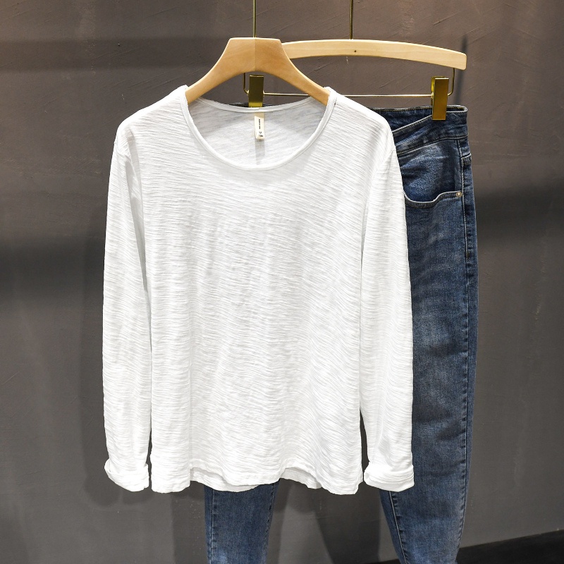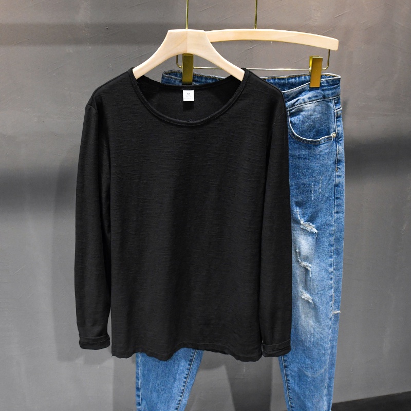 {เก็บ } ญี่ปุ่นพื้นฐานรอบคอเลื่อนผ้าฝ้ายแขนยาวเสื้อยืดผู้ชายขอบดิบสบายๆ จุดต่ําสุด เสื้อ บาง-พอดี