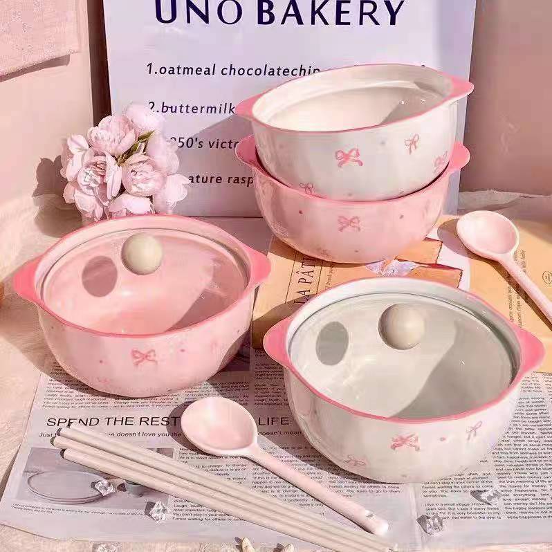 ถ้วยจานชามลายโบว์ ลายน่ารักมีสองสีโบว์ขาวและโบว์ชมพู