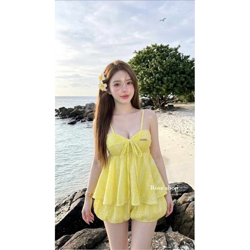 เซท 3 ชิ้น งานสายเดี่ยวผูกโบว์หน้าสายปรับได้ อกเสริมฟองน้ำ มาพร้อมกางเกงบอลลูนมีซับใน