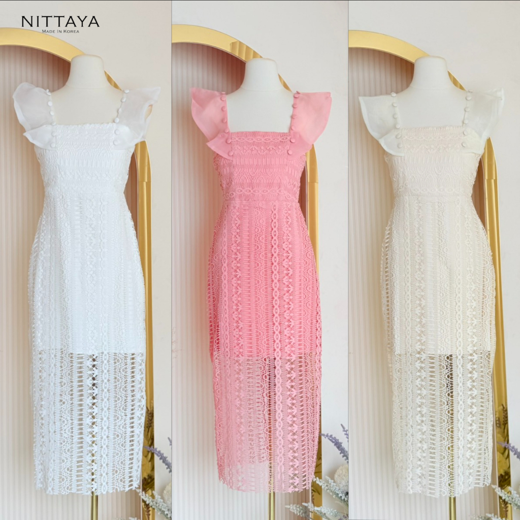 [NITTAYA] D2861 ชุดเดรสกระโปรงยาวแขนระบายแต่งกระดุมผ้าลายลูกไม้ สวยหรูดูแพงผู้ดี ใส่ออกงาน ดินเนอร์ งานแต่ง