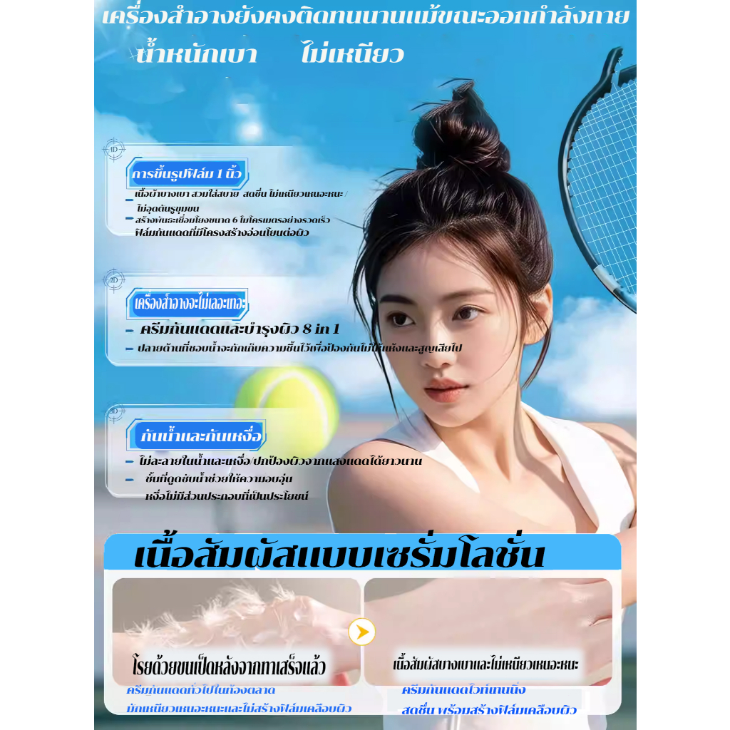 ครีมกันแดด SPF50+ ปกป้องผิวจากรังสี UVA และ UVB มีคุณสมบัติกันแดด กันเหงื่อ กันน้ำ เนื้อบางเบา ซึมซาบง่าย เกลี่ยง่าย สบา