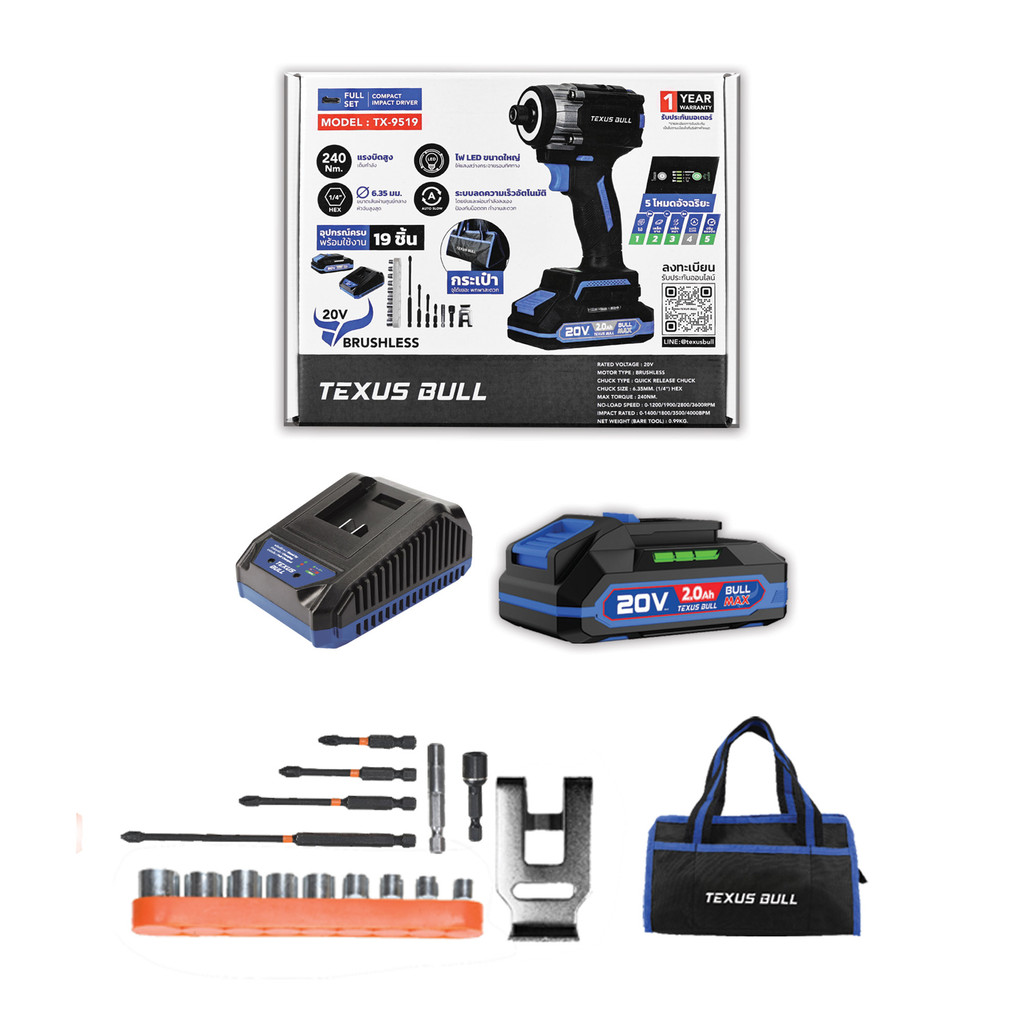 ðTEXUS BULLðĪāđāļāļāļ§āļāļāļĢāļ°āđāļāļ 20V āļāļĢāđāļāļĄāļāļļāļāļāļĢāļāđ 19 āļāļīāđāļ āļĢāļļāđāļ TX-9519 (āđāļāļ 2.0Ah x 1) , āļāļąāļ§āđāļāļĨāđāļē āļĢāļļāđāļ TX-9516 (16 āļāļīāđāļ)