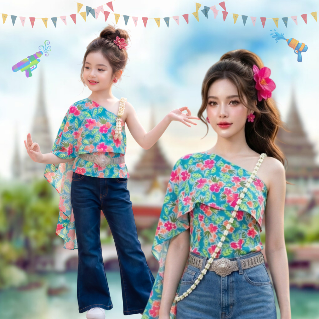 สไบ สำเร็จรูป แม่ลูก เสื้อสไบ สไบลายดอกไม้ สงกรานต์ Bangkok City สไบเด็ก ชุดไทยเด็ก สไบประยุกต์