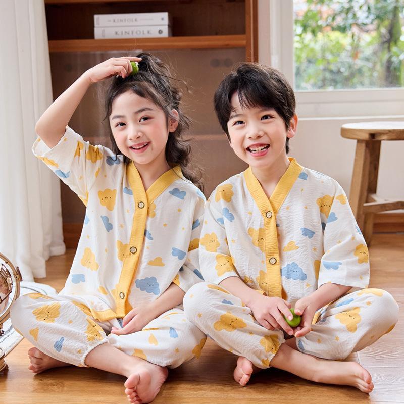พร้อมส่ง-ชุดนอนเด็ก ชุดนอนกระดุมน่า+กางเกงขายาวชุดนอนห้องแอร์ ผ้าฝ้าย พิมพ์ลายการ์ตูน Size80-120cm🔥D7251💫