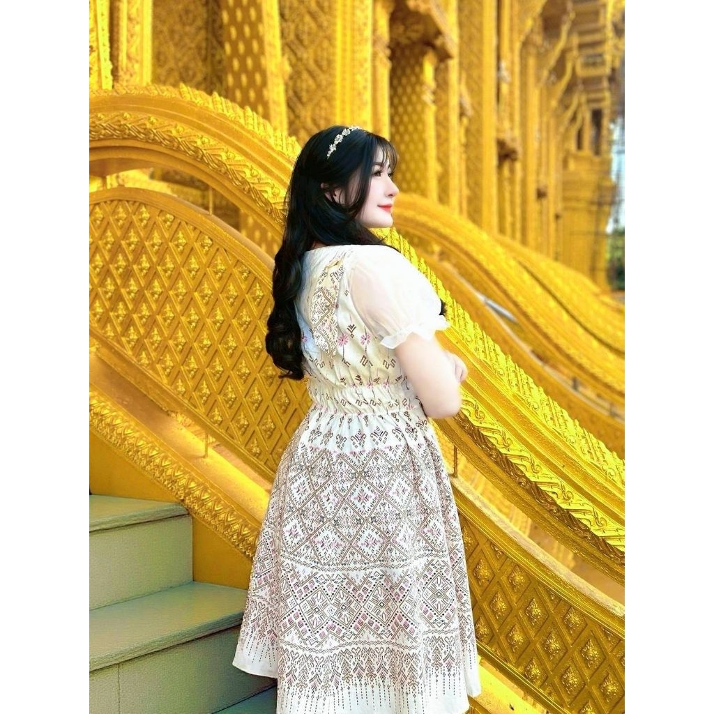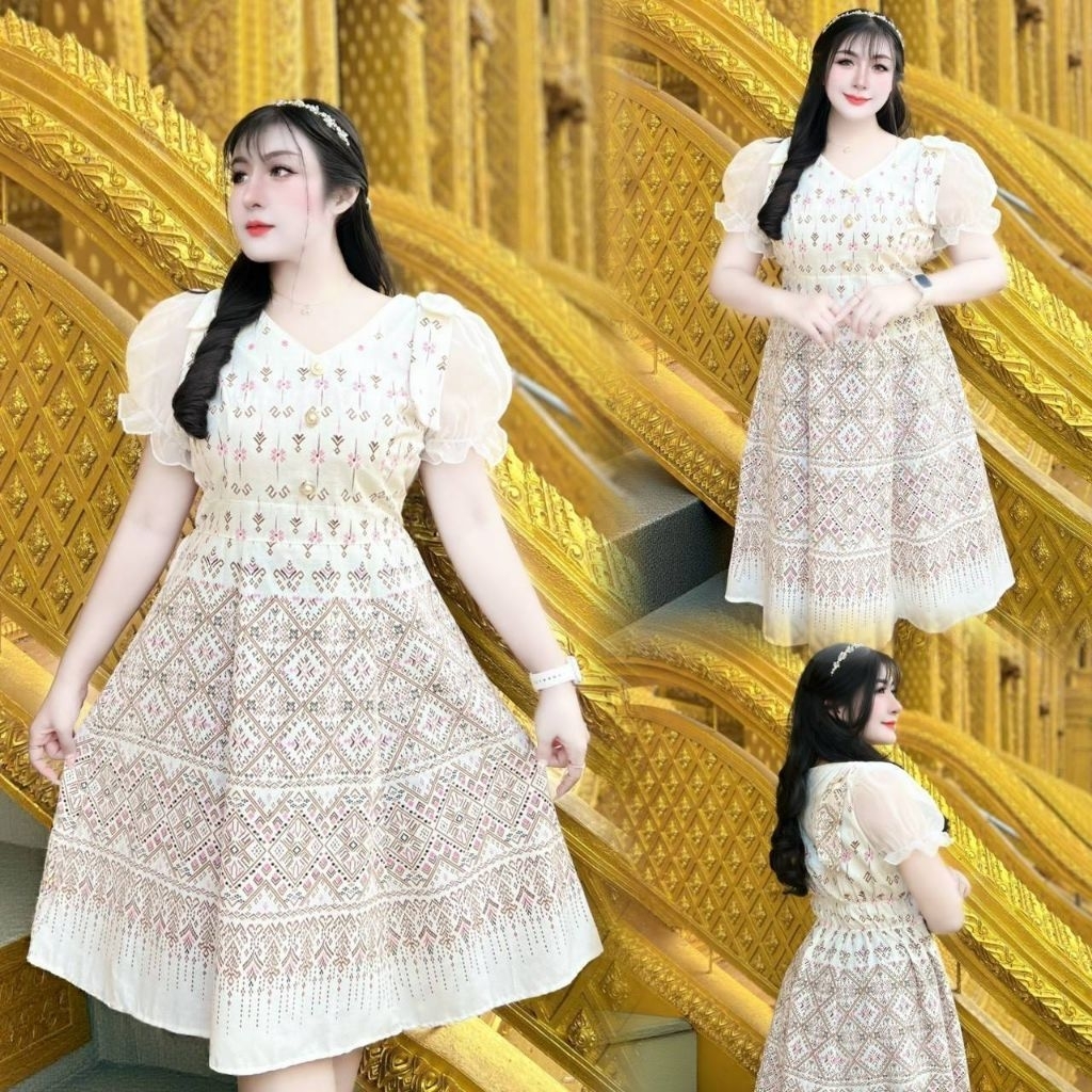 ชุดเดรสผ้าไทยประยุกต์ทรงย้วยแต่งโบว์ไหล่สวยมากกใส่ออกงานพิธีการงานบุญต่างๆ