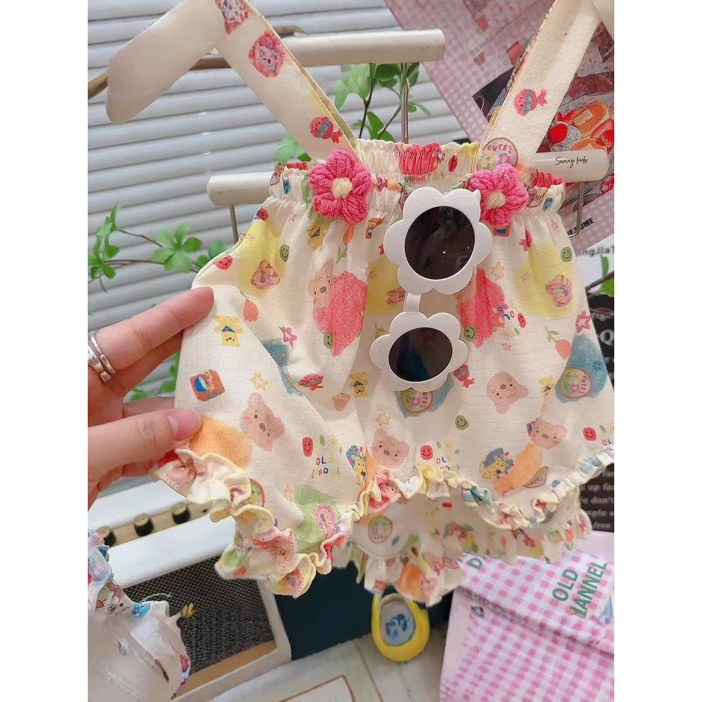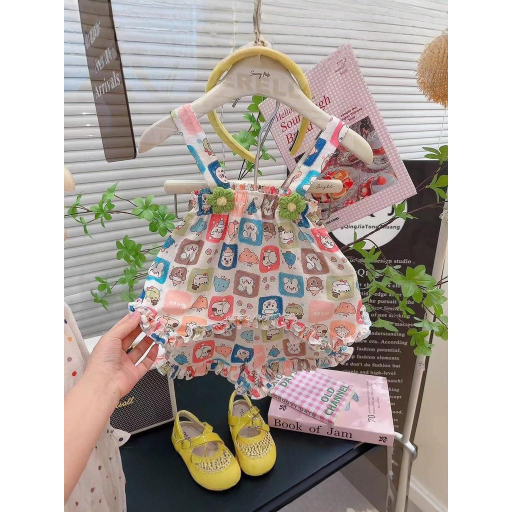 HH05 เสื้อผ้าเด็กหญิง 2025 ใหม่ล่าสุด ชุดกระโปรงเด็กหญิง ลายดอกไม้สามมิติ เสื้อแขนกุด+กางเกงขาสั้น 2 ช