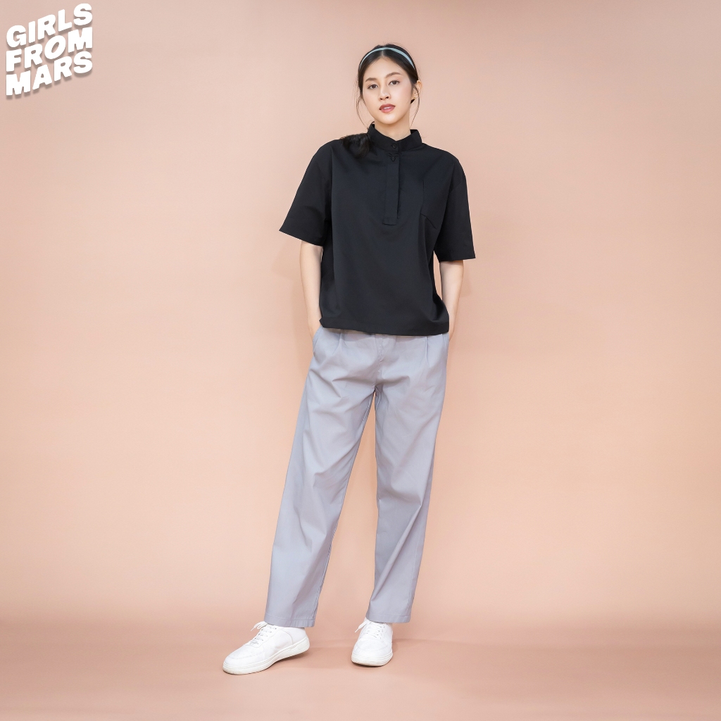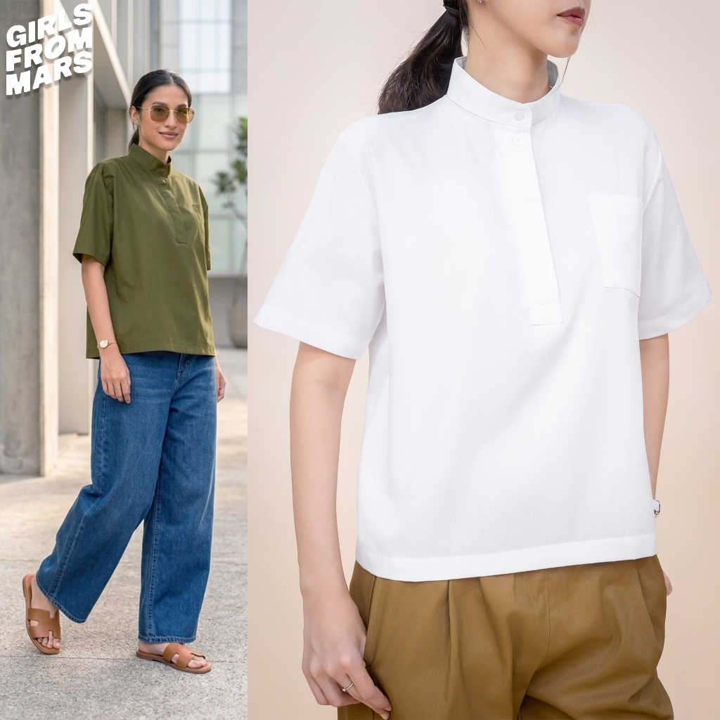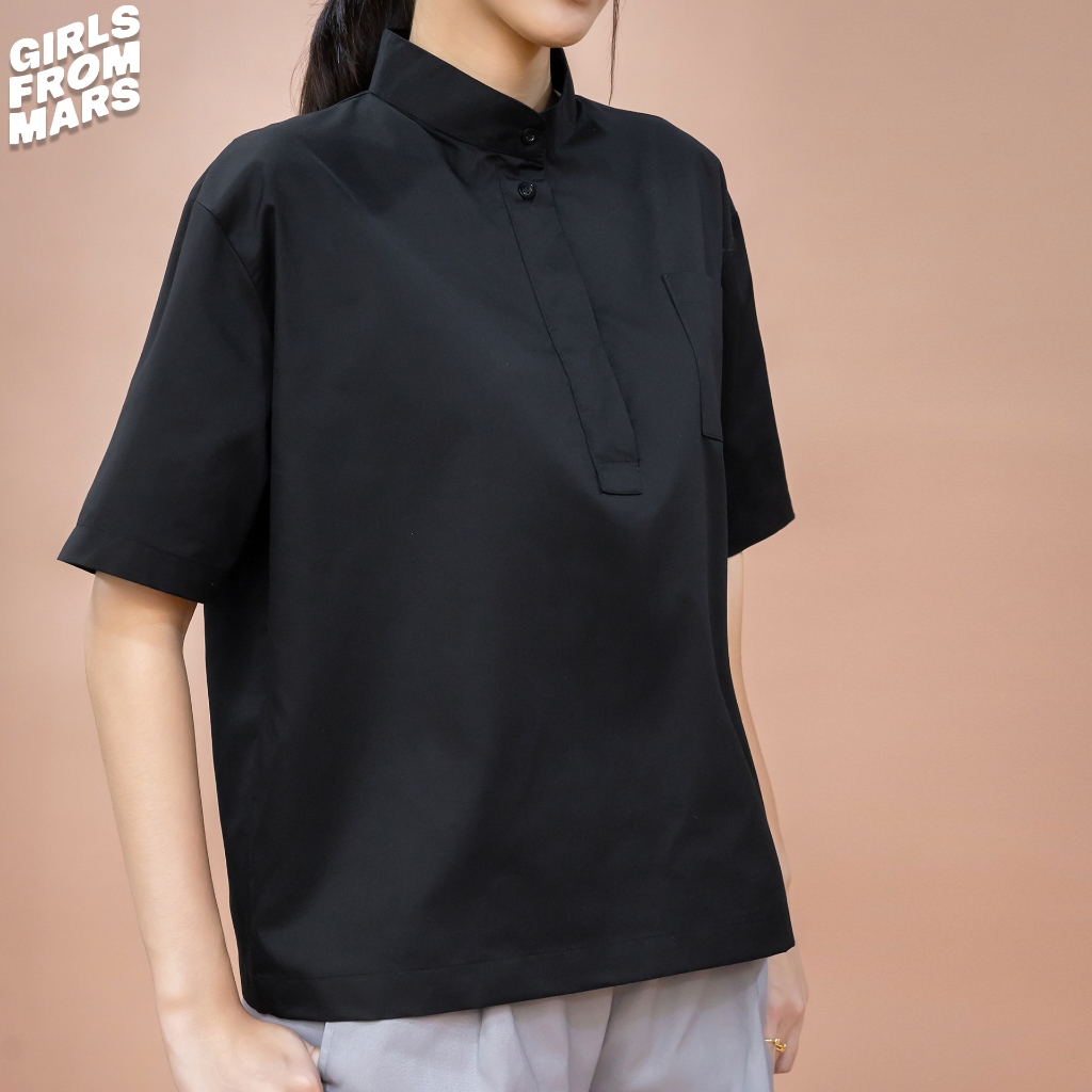 GirlFromMars เสื้อเชิ้ตแขนสั้นผู้หญิง ทรง Oversized คอจีน (Stand Collar) ผ้า Cotton 100% นุ่มใส่สบาย เสื้อเชิ้ตมินิมอล