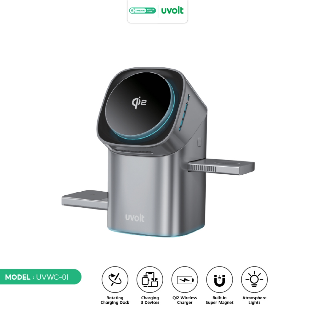Uvolt รุ่น UVWC-01 ชาร์จเร็ว 15W แท่นชาร์จไร้สาย3In1 มาตรฐาน Qi2รองรับ Phone,หูฟังไร้สาย,Smart Watch