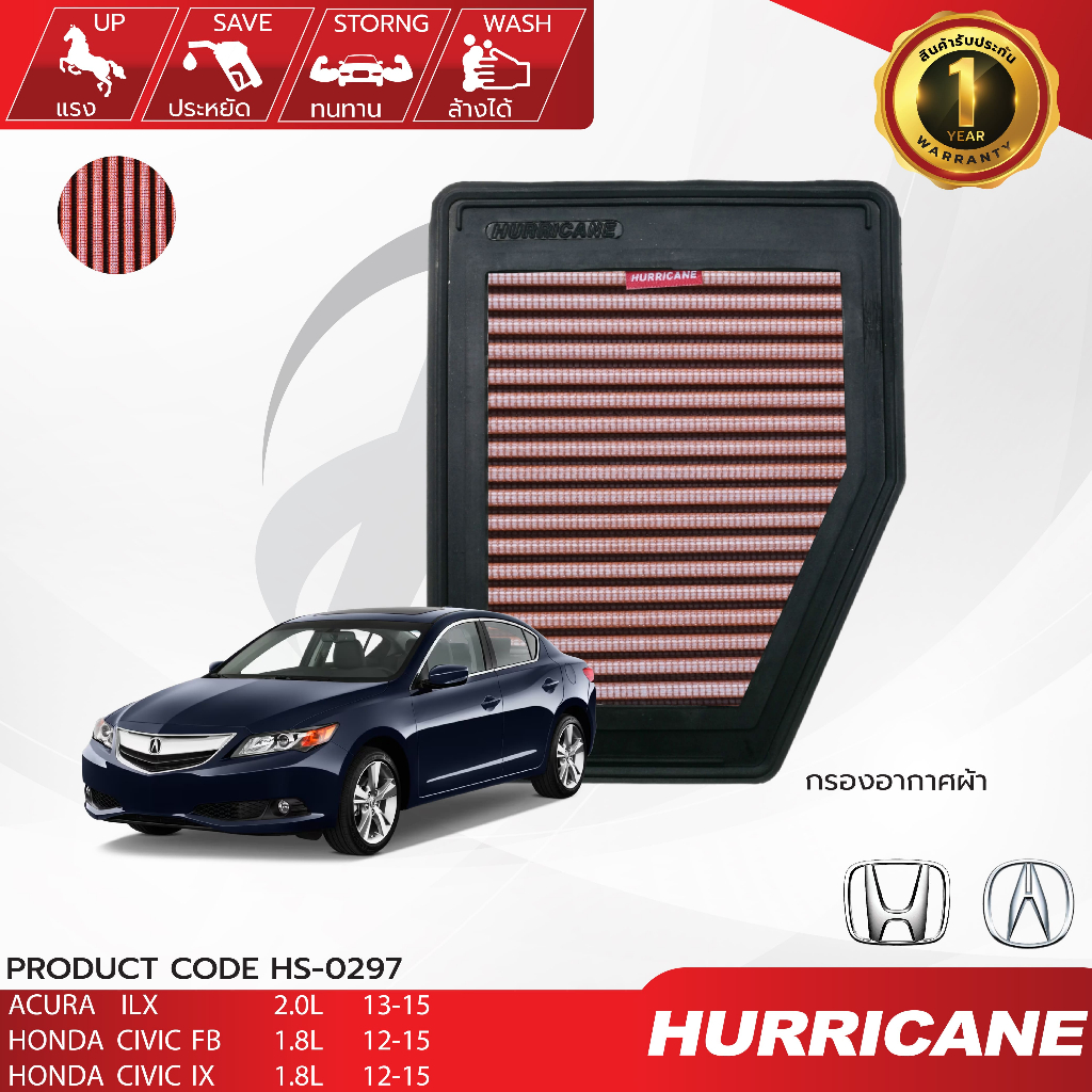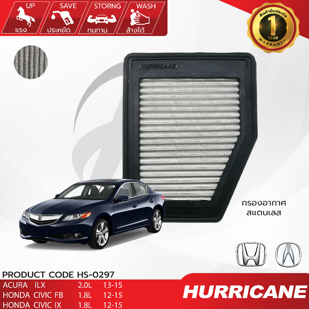 HURRICANE กรองอากาศรถยนต์ผ้าแดง & สแตนเลส Acura , Honda HS-0297