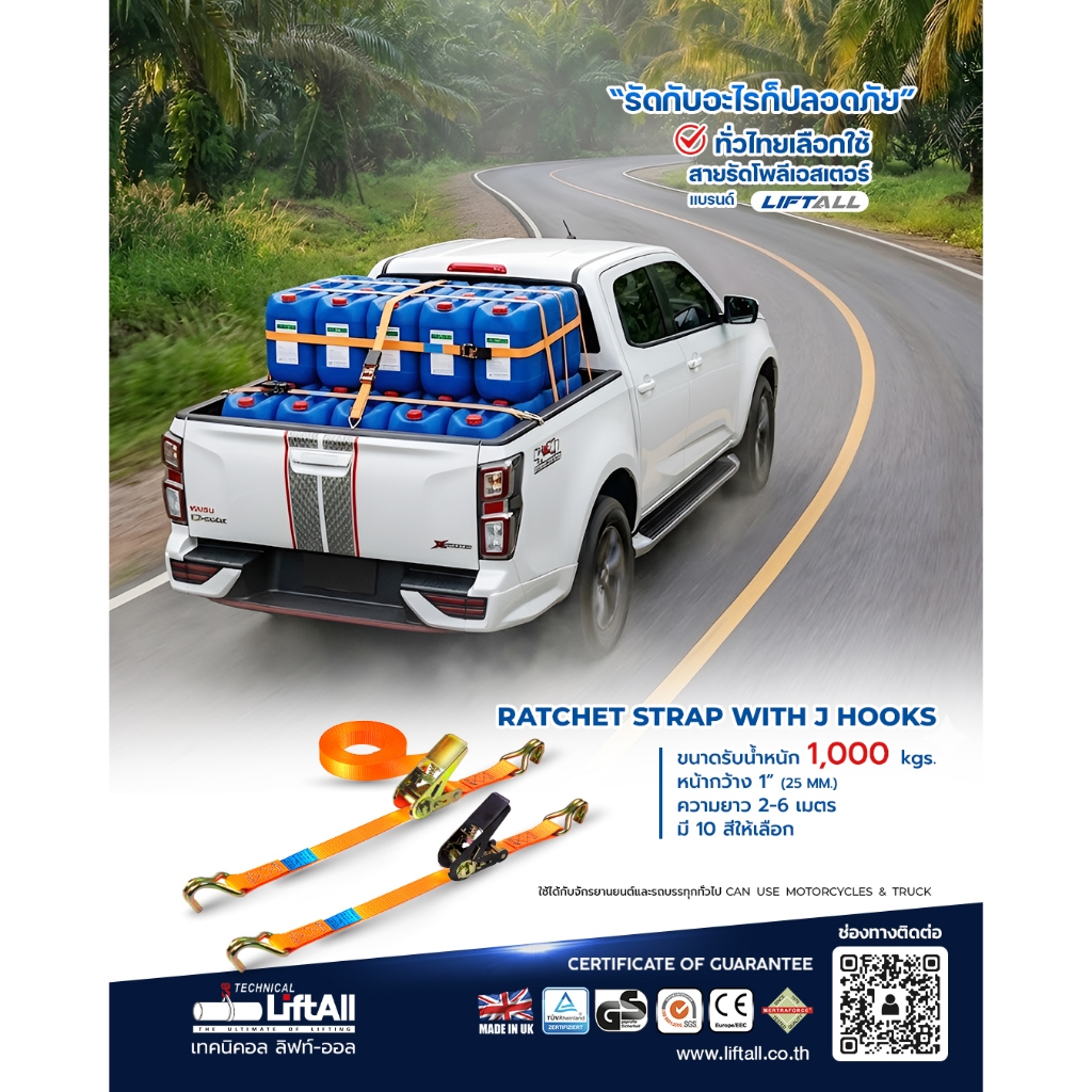 LIFTALL สายรัดของ ขนาด 1 นิ้ว รับ นน. 1 ตัน ชนิดมีตะขอ LSW2510B สายรัด ก๊อกแก๊ก สายเบลท์รัดของ เชือกรัดของ สายรัดรถกระบะ