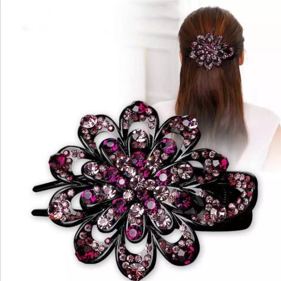 คลิปหนีบผมไซส์กลางอคลิลิกดำประดับเพชรหลากสีสต็อกไทยพร้อมส่ง