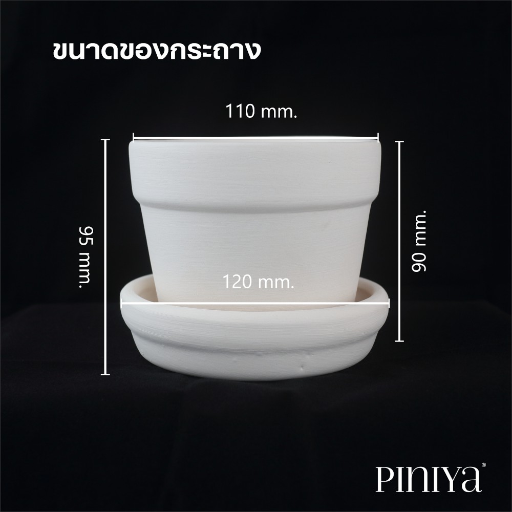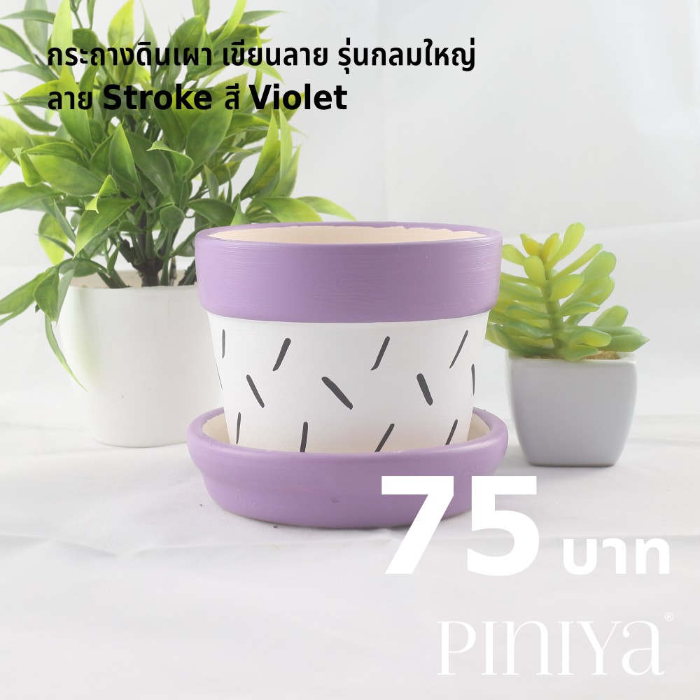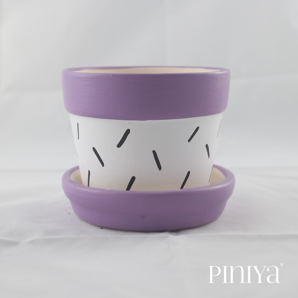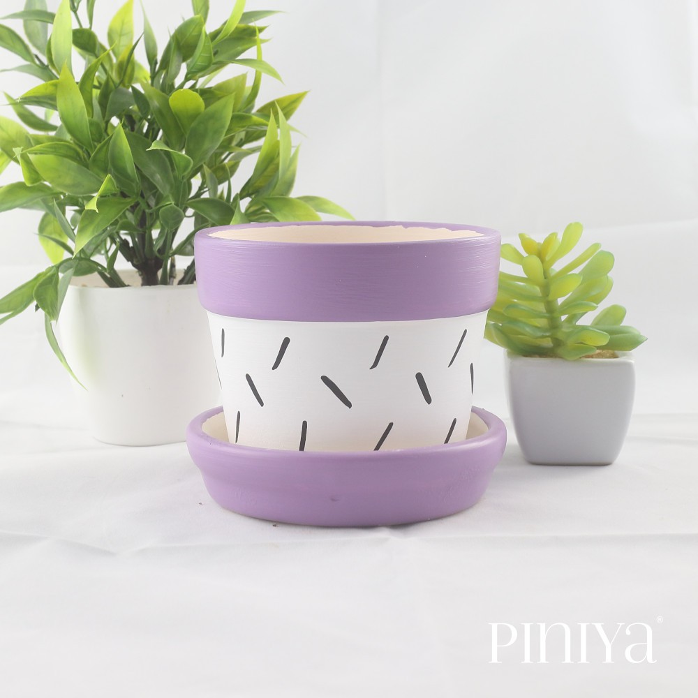 Piniya พินิยา - กระถางต้นไม้ ดินเผา รุ่น กลมใหญ่, 12ซม., ลาย Stroke, สี Violet (ม่วง), พร้อมจานรอง