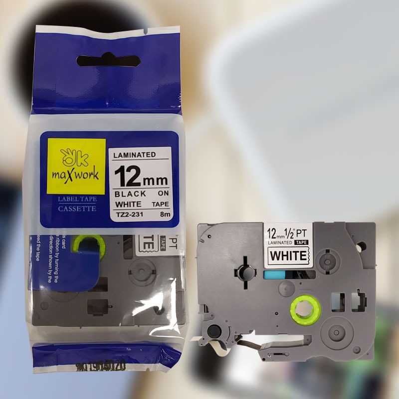 เทปพิมพ์อักษร OK MAXWORK 12 mm TZE Brother TZE-231(TZ2-231) พื้นสีขาว ตัวอักษรสีดำ