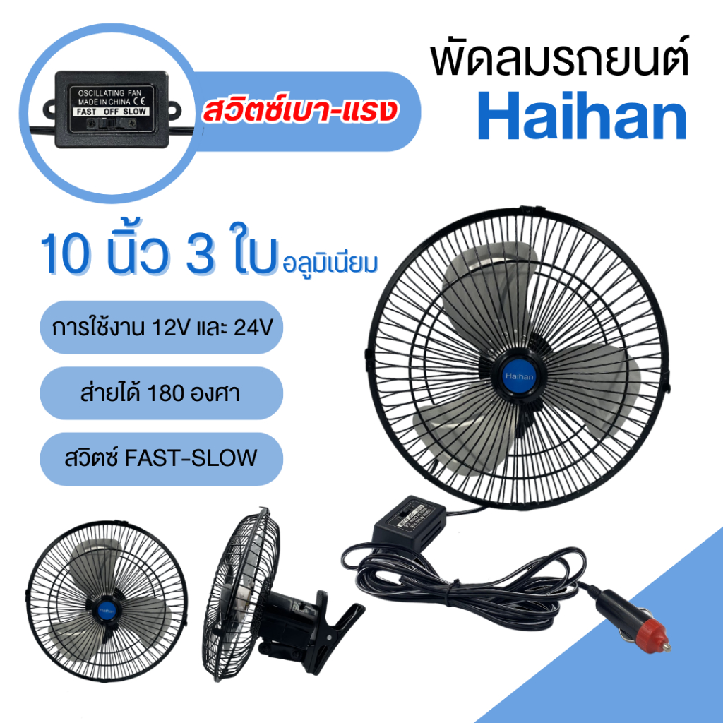 พัดติดรถยนต์ Haihan 10 นิ้ว 3 ใบพัด ไฟรถ DC- 12V/24V พัดลมติดรถยนต์