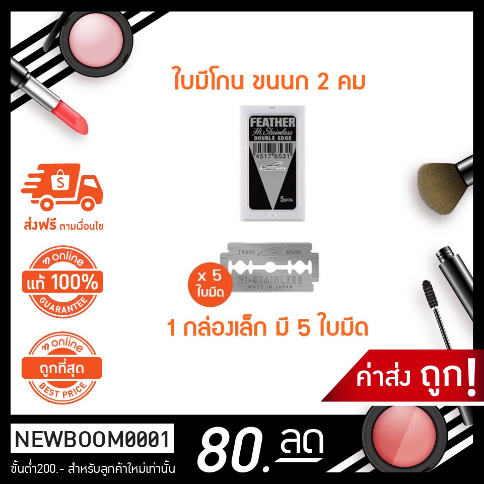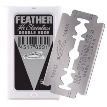 (1 กล่องมี 5 ใบ) Feather Cut ใบมีด โกน 2คม มีดโกนหนวด มีดกันคิ้ว ขนนก Hi-Stainless Plattinum Coated Blade Made In Japan