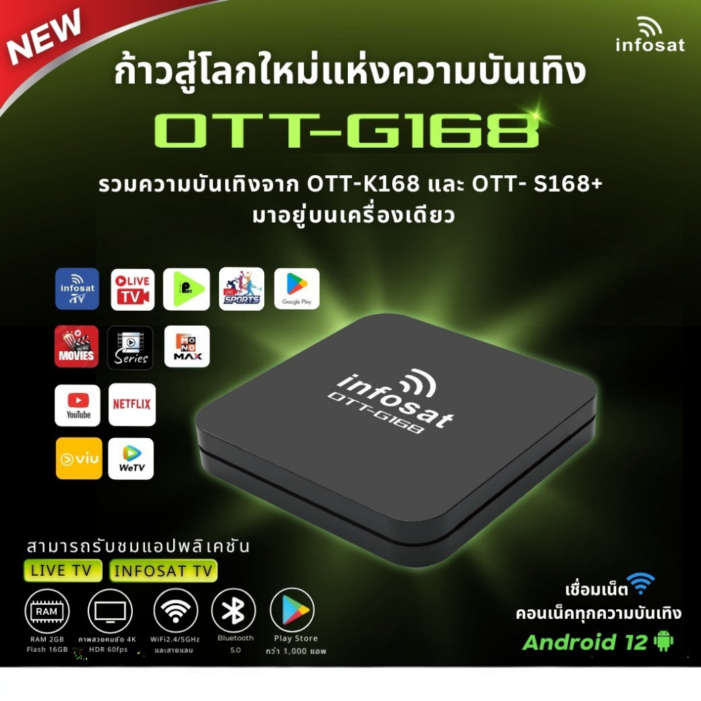 G168 (Android 12) กล่องทีวีอินเตอร์เน็ต (Infosat TV, Mono Max, Netflix, Ais Play) INFOSAT