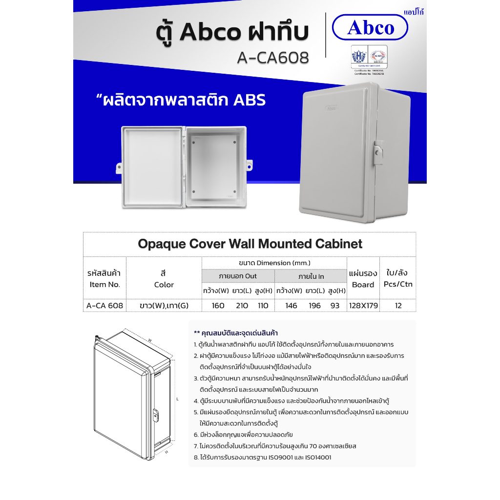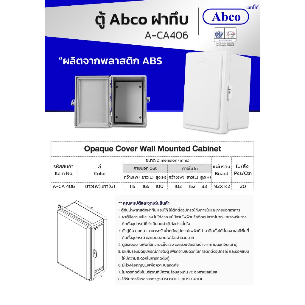 ABCO ตู้พลาสติกกันน้ำ ฝาทึบ มีหลังคา 4x6 และ 6x8 นิ้ว A-CA416, A-CA618 สีขาว สีเทา