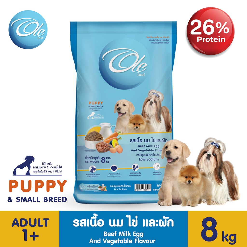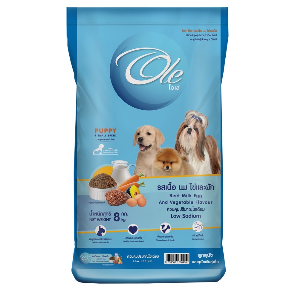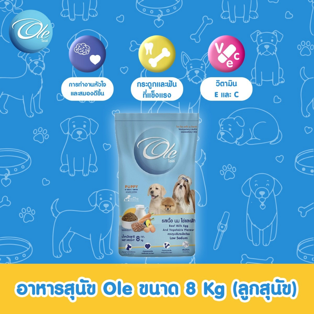 Ole รสเนื้อ นม ไข่และผัก ขนาด 8 kg. อาหารเม็ดสำหรับลูกสุนัขทุกสายพันธุ์อายุ 2 เดือน
