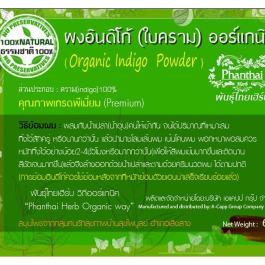 อินดิโก้ย้อมผม(ผงใบครามย้อมผม) ยี่ห้อพันธุ์ไทยเฮิร์บ "ทำจากธรรมชาติ100%" (เกรดพรีเมี่ยมปริมาณ60กรัม)