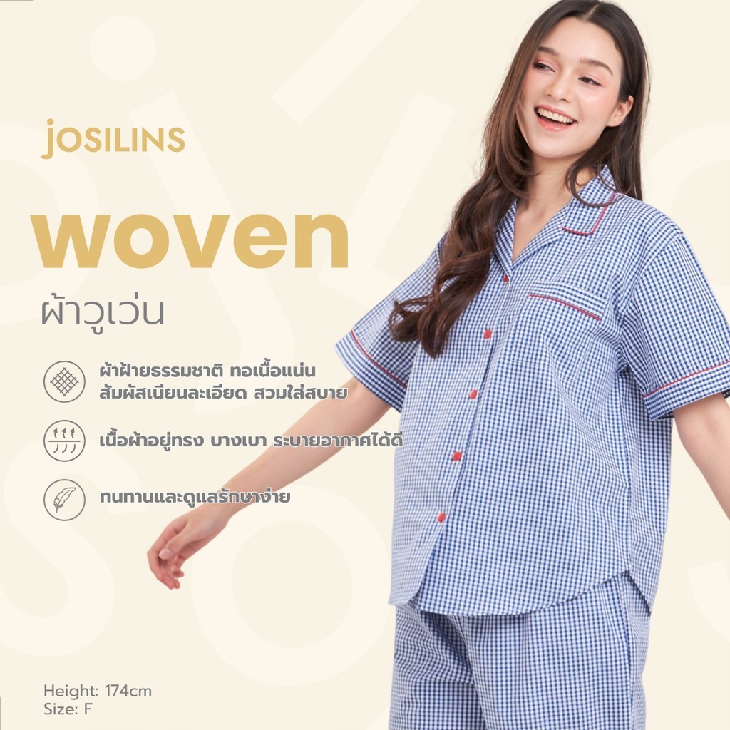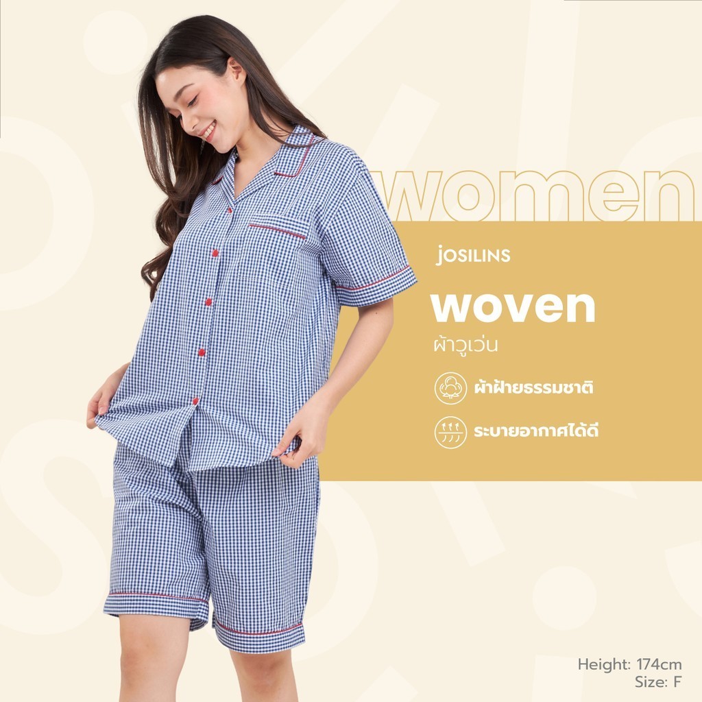 Josilins ชุดนอน ชุดอยู่บ้าน ผู้หญิง เสื้อแขนสั้น ขาสั้น ผ้าวูเว่น ลายคลาสสิค ตาราง ริ้ว สก๊อต ฟรีไซส์ SM 2025