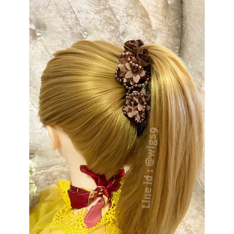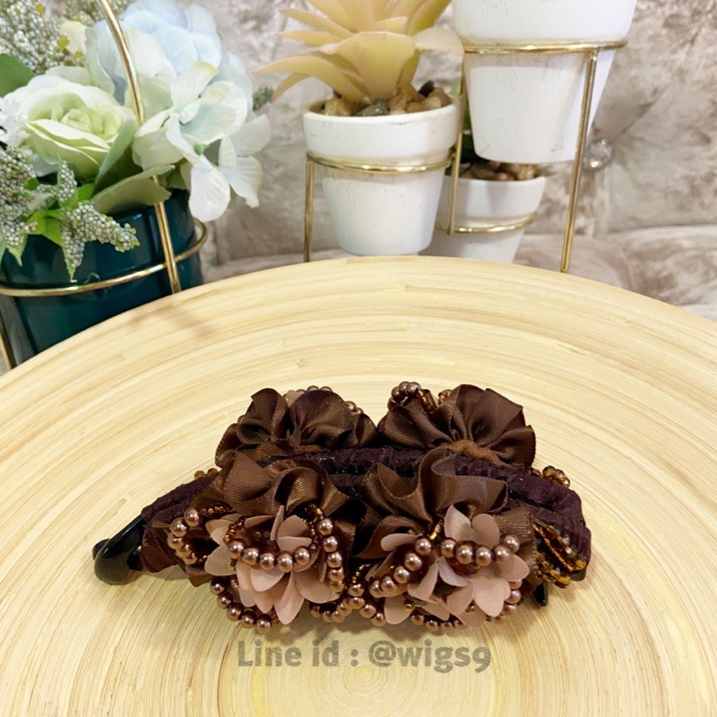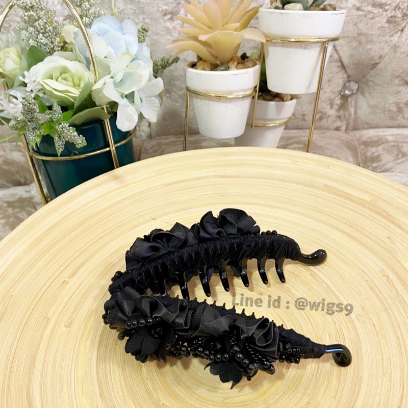 กิ๊ฟกล้วยคริสตัล 5 นิ้ว แฮนด์เมดสุดปราณีต ดอกผ้าซีทรูผสมซาติน ไข่มุกถักลอย ห้อยลูกปัด หรู ใส่ออกงาน ดูแพง