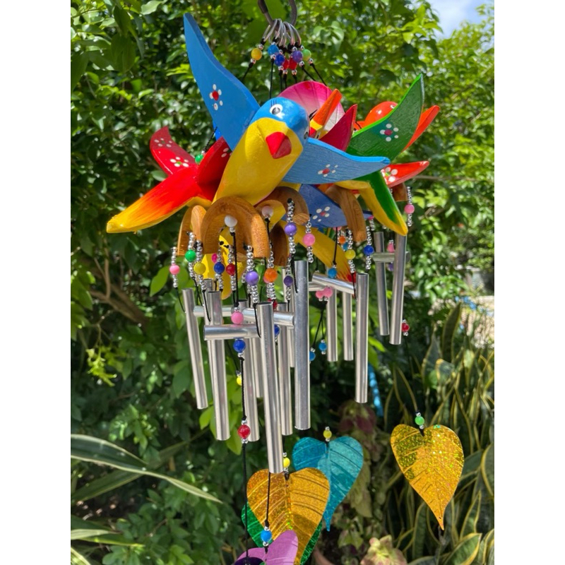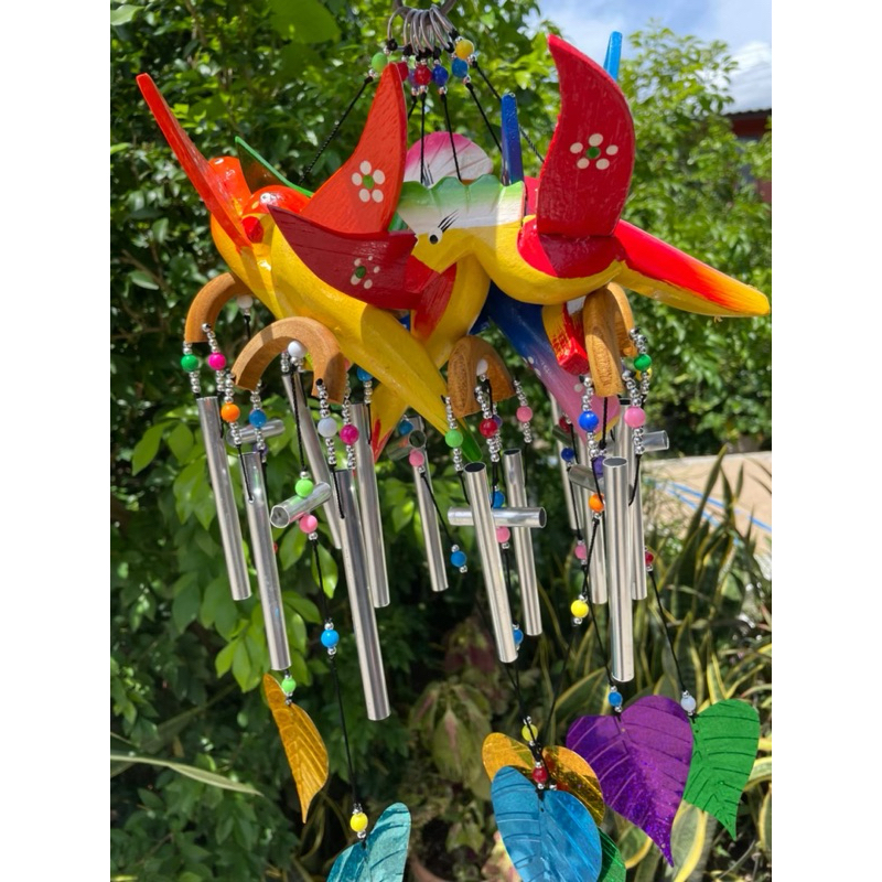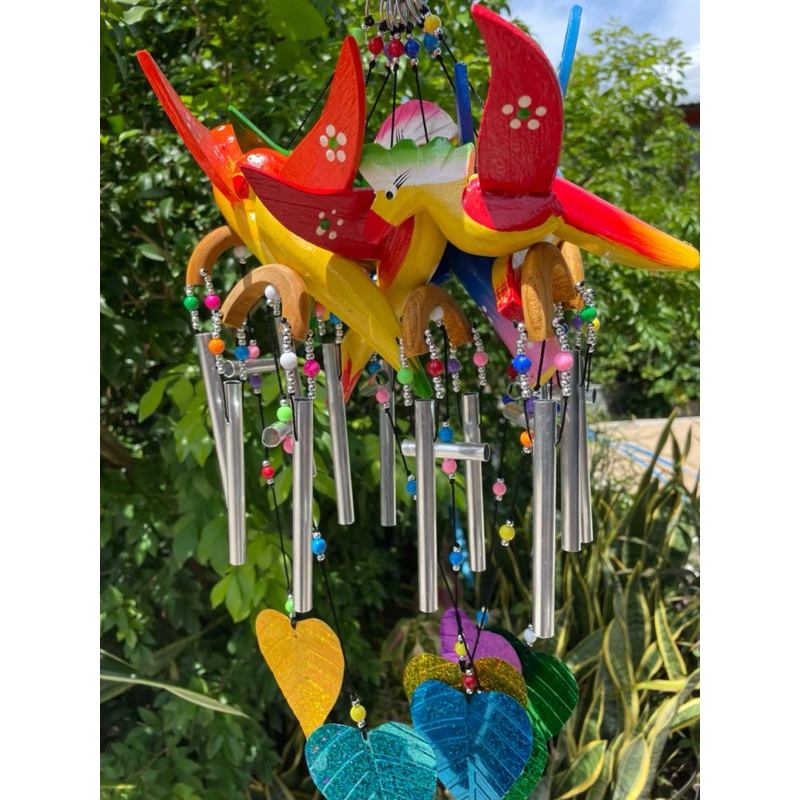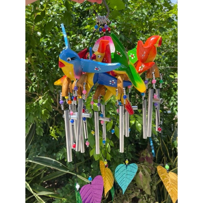 โมบายกระดิ่งลม นกเกาะ สลักไม้สองแท่ง(พร้อมหางขนไก่)โมบายแขวน
