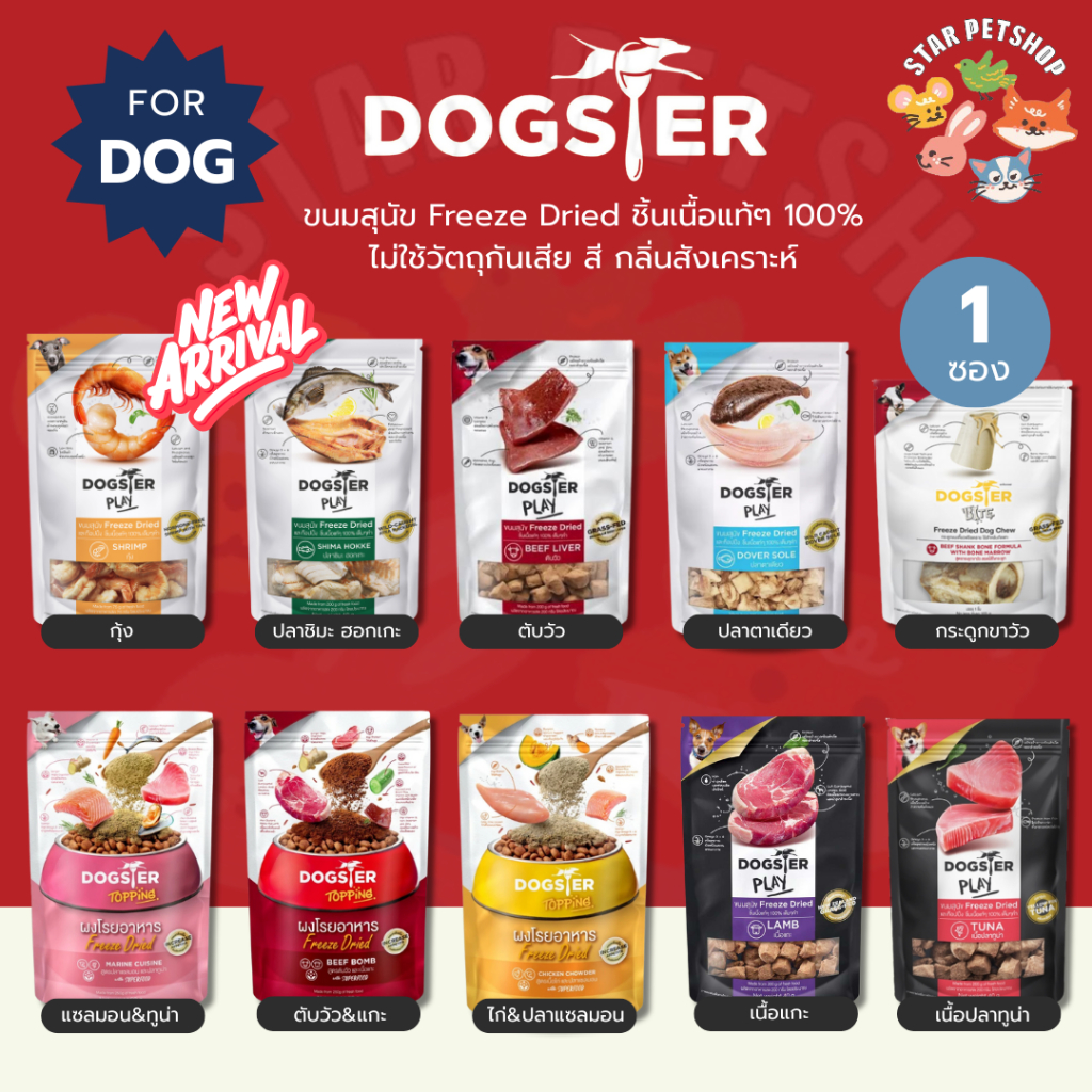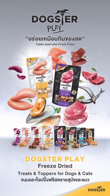 DOGSTER PLAY ขนมสุนัข Freeze Dried ชิ้นเนื้อแท้ๆ 100% ไม่ใช้วัตถุกันเสีย สี กลิ่นสังเคราะห์