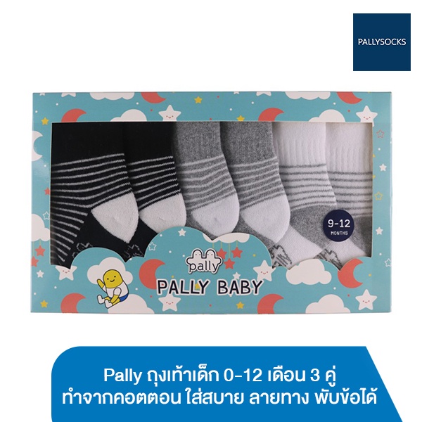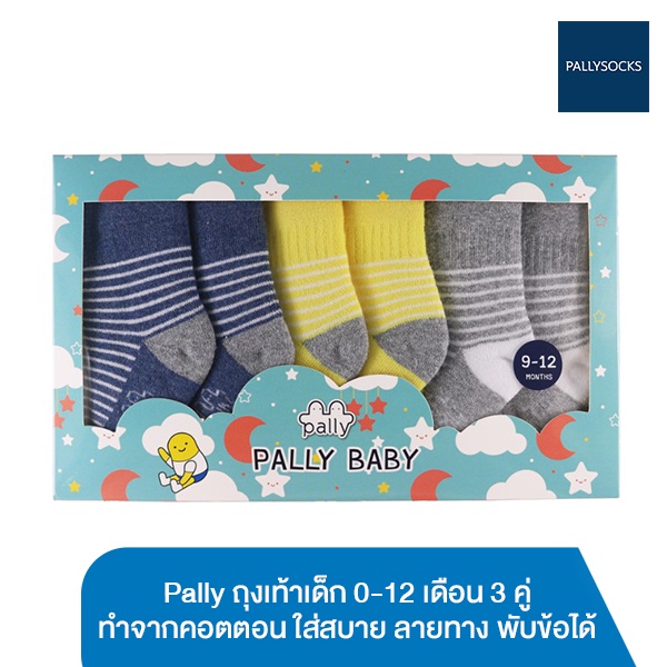 Pally ถุงเท้าเด็ก 0-12 เดือน 3 คู่ ทำจากคอตตอน ใส่สบาย ลายทาง พับข้อได้