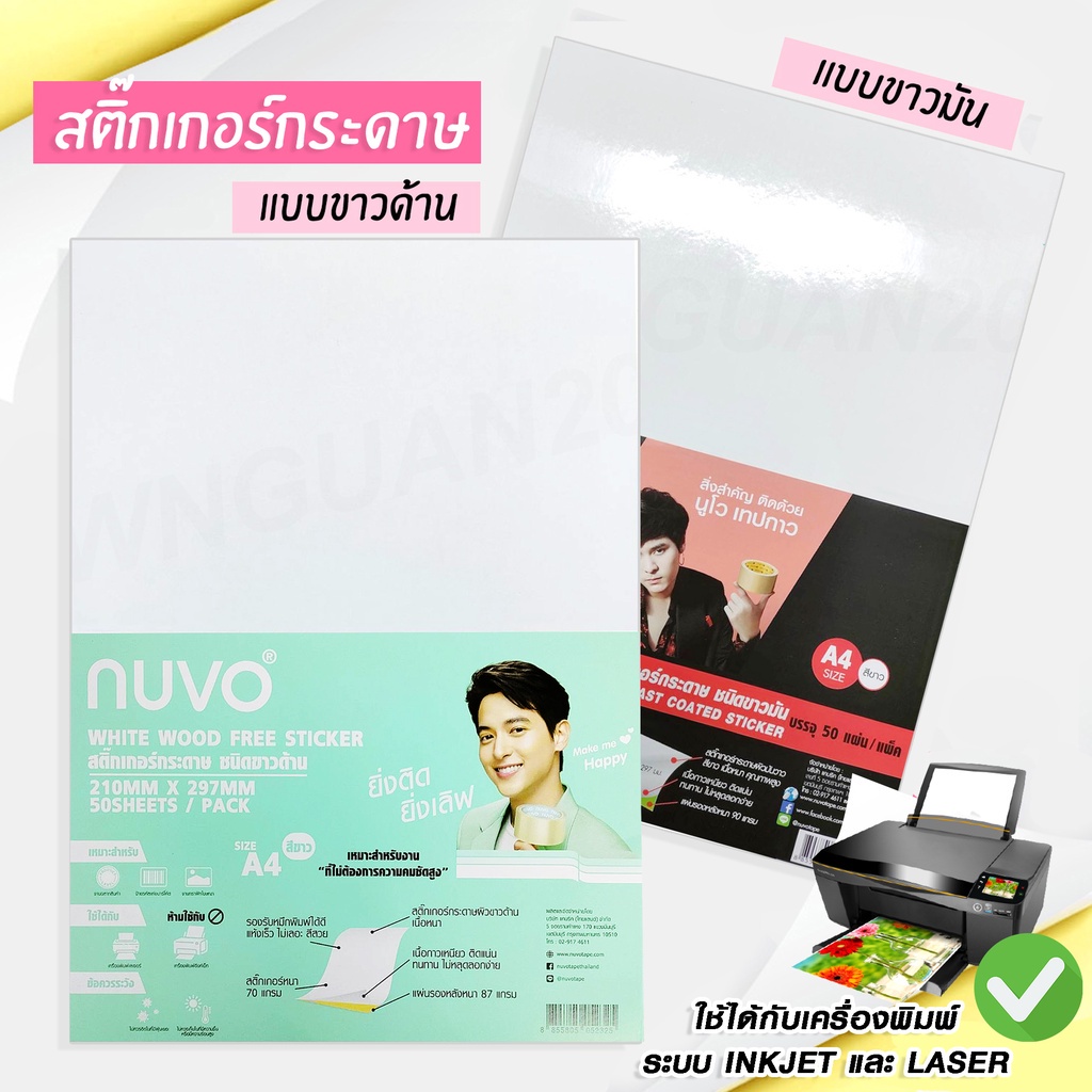 กระดาษสติ๊กเกอร์ A4 เนื้อขาวด้าน ตรานูโว NUVO จำนวน 10 หรือ 50 แผ่น (white wood sticker) กระดาษขาวด้าน จำนวน 1 รีม
