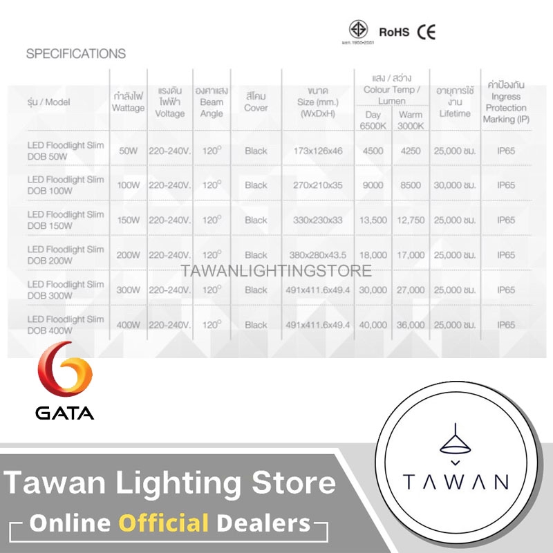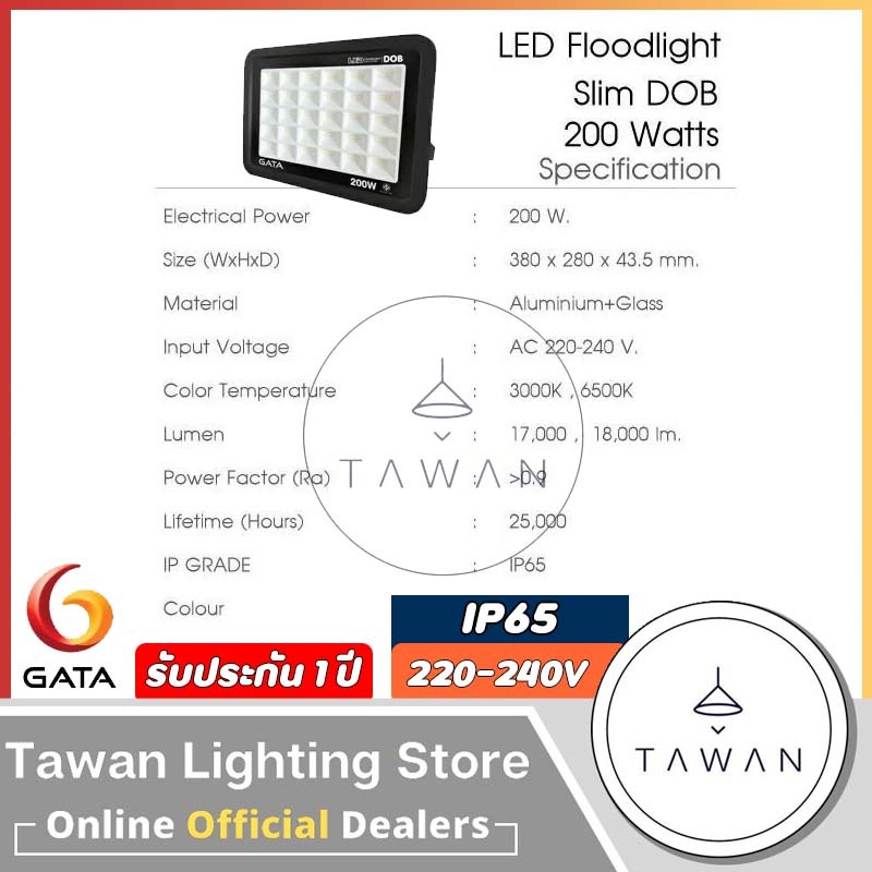 GATA Floodlight โคมฟลัดไลท์ โคมไฟสปอร์ตไลท์แอลอีดี 200วัตต์ LED 200W Daylight แสงขาว Warmwhite แสงเหลือง รุ่น Slim DOB