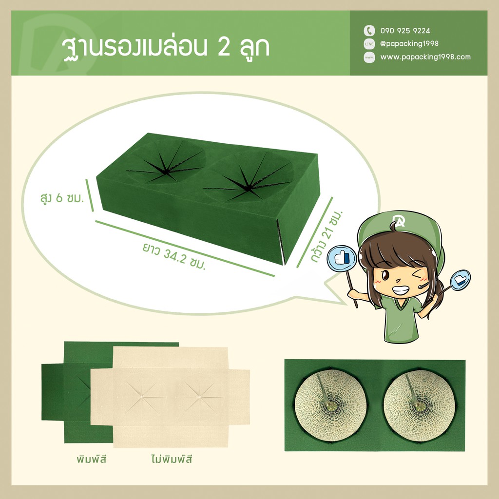กล่องใส่เมล่อน 2 ลูก + ฐานรองผลเมล่อน (21.5 x 35 x 18 ซม.) (แพ็คละ 25 กล่อง) (ใช้กระดาษแข็งแรงเป็นพิเศษ)