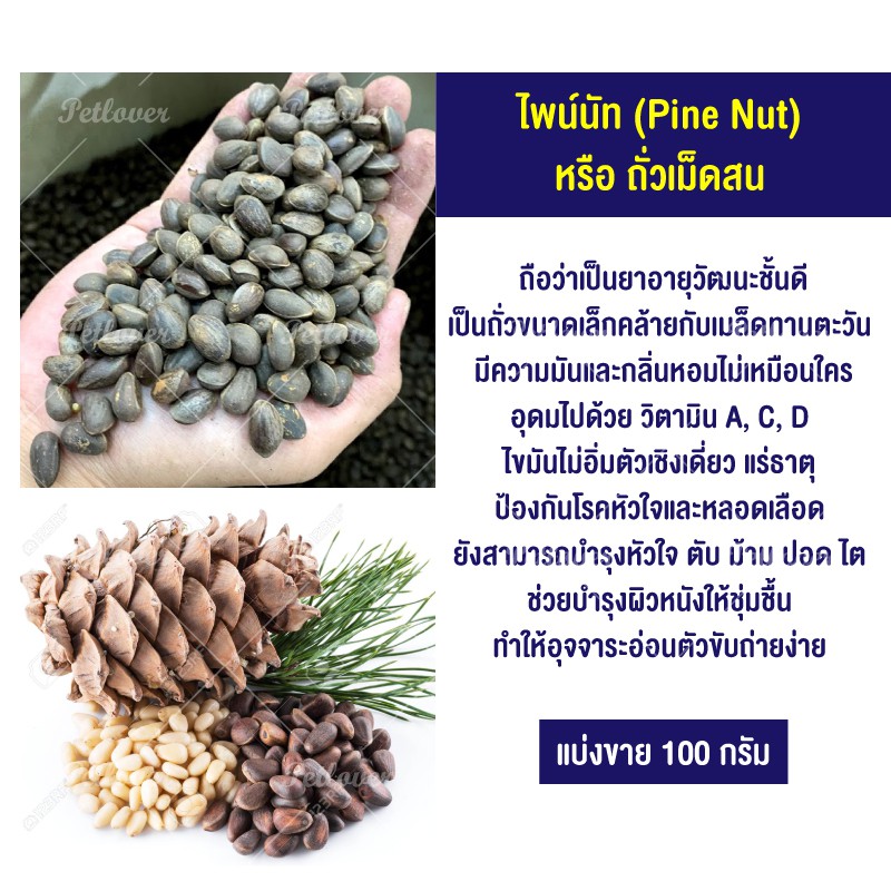 ไพน์นัท Pine Nut หรือ ถั่วเม็ดสน สำหรับนกแก้วขนาดกลาง - ใหญ่ และสัตว์ฟันแทะ (แบ่งขาย 50G / 100G)