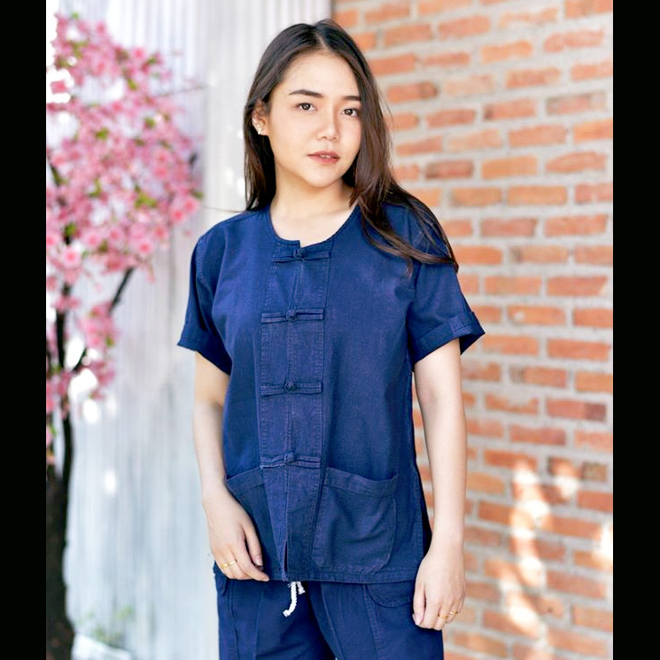 ม่อฮ่อม คอกลม กระดุมจีน แบบดั้งเดิม (ชายหญิงใส่ทรงเดียวกัน) ไม่เข้ารูป เนื้อม่อฮ่อมแพร่แท้ๆ ไม่ย้วย (เพิ่มฟิกสีกันสีตก)