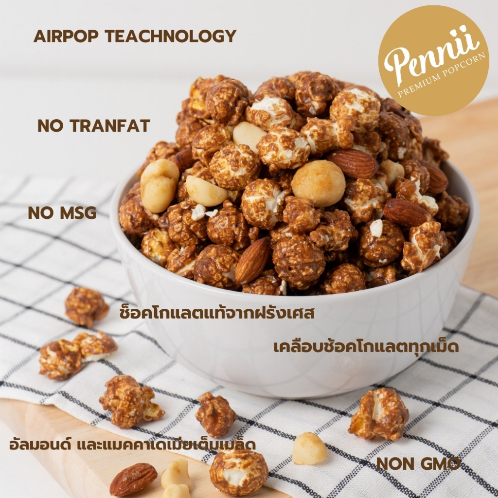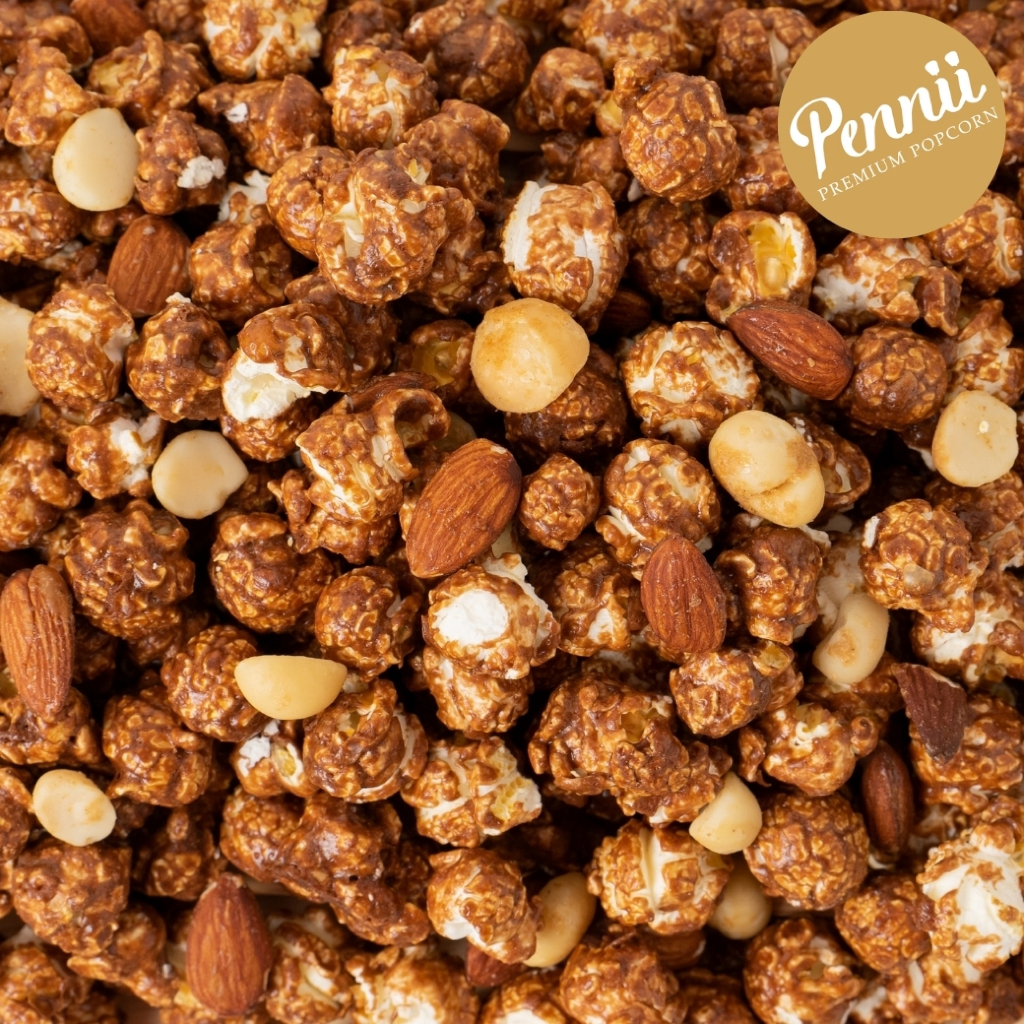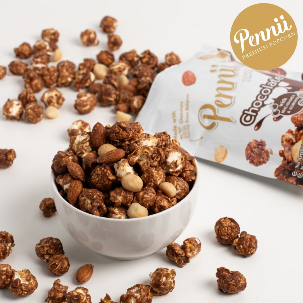 ขนมป๊อปคอร์น รสช็อกโกแลต แมคคาเดเมีย อัลมอนด์ ไม่มีไขมันทรานส์ Size L 150 g Pennii Premium Popcorn