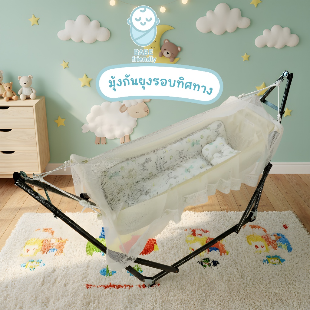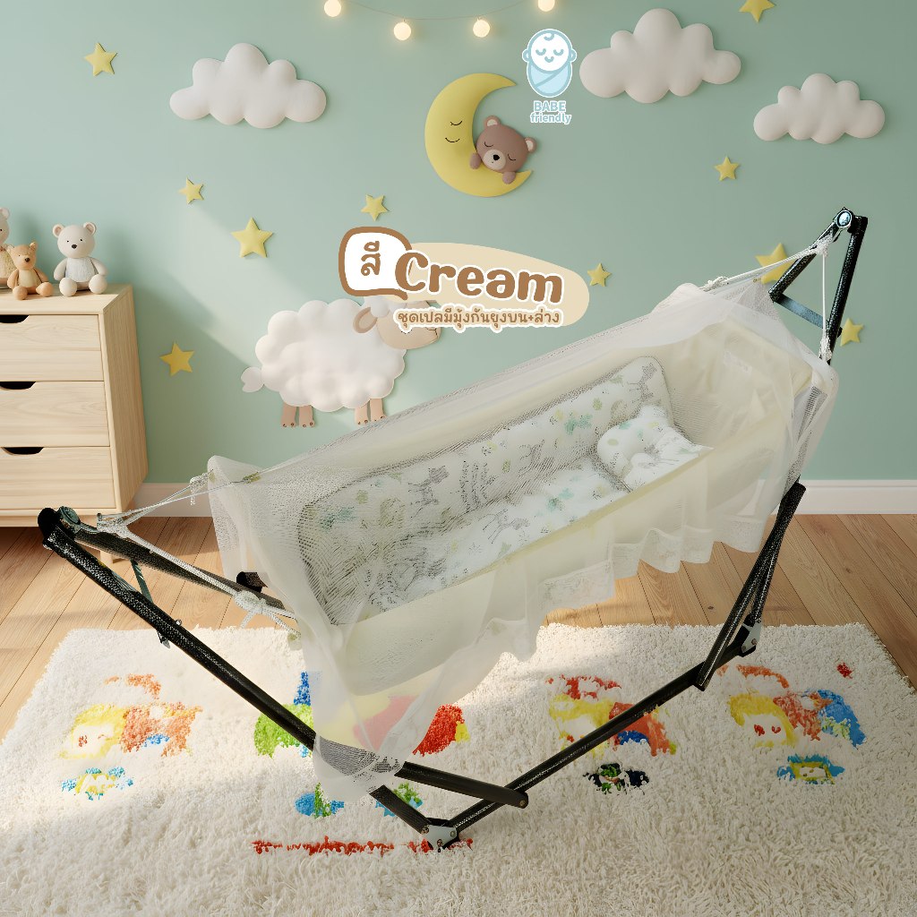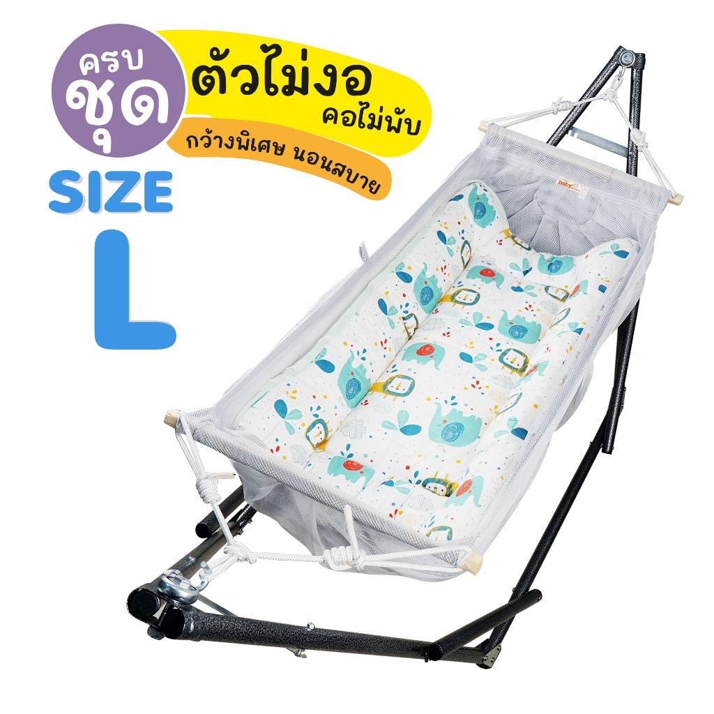 ครบชุด SIZE L-แบบใหม่ ขนาดใหญ่ เปลไกวเด็กตัวไม่งอ ผ้ากว้างมาก นอนตะแคงได้เลย มีมุ้งครบ+แผ่นรองเปล