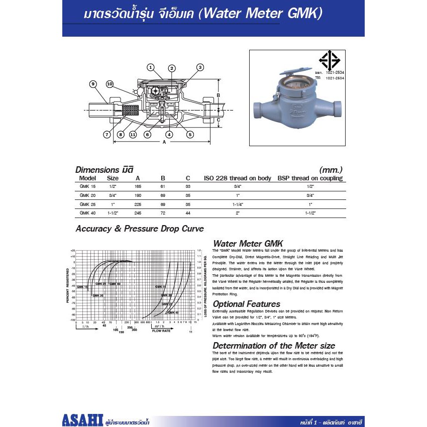 มิเตอร์น้ำ มาตรวัดน้ำ อาซาฮี (ซันวา) ASAHI GMK25 ขนาด 1"