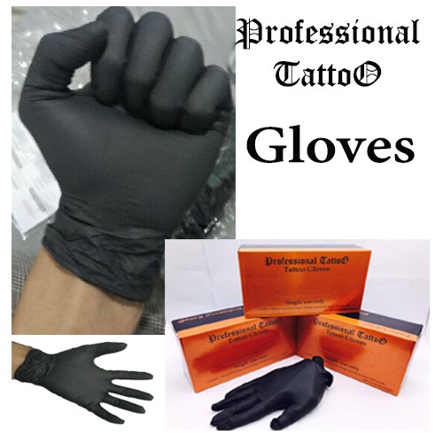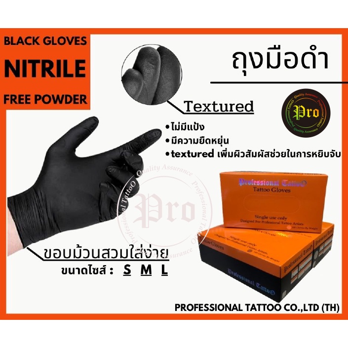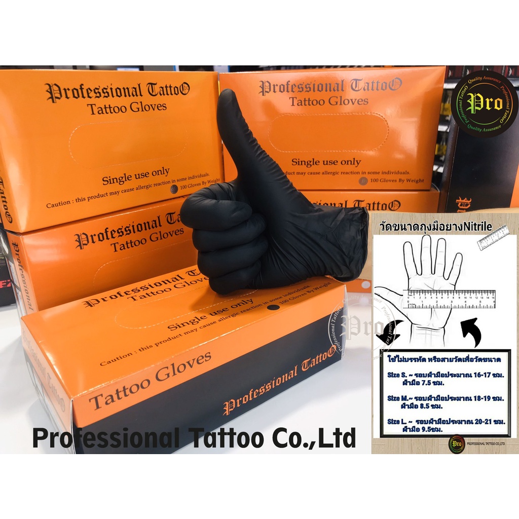 ถุงมือสีดำช่างสักถุงมือยางไนไตรสีดำ ไม่มีแป้ง Size S , M ,L มี 100ชิ้น ถุงมือProfessional Tattoo กล่องส้ม แบบหนา