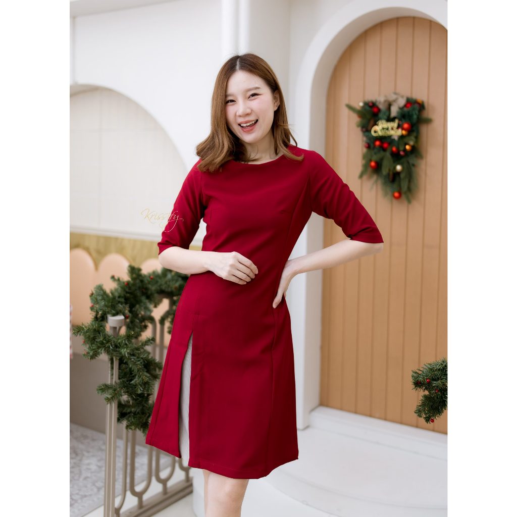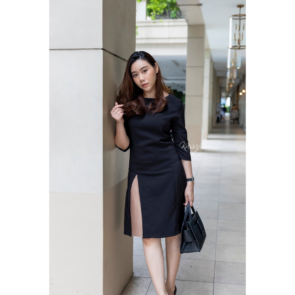 D18-013 : เดรสแขนห้าส่วน กระโปรงทรง A เล่นดีไซน์ผ่าหน้าด้านขวา มี 6 สี ซิปหลังค่ะ