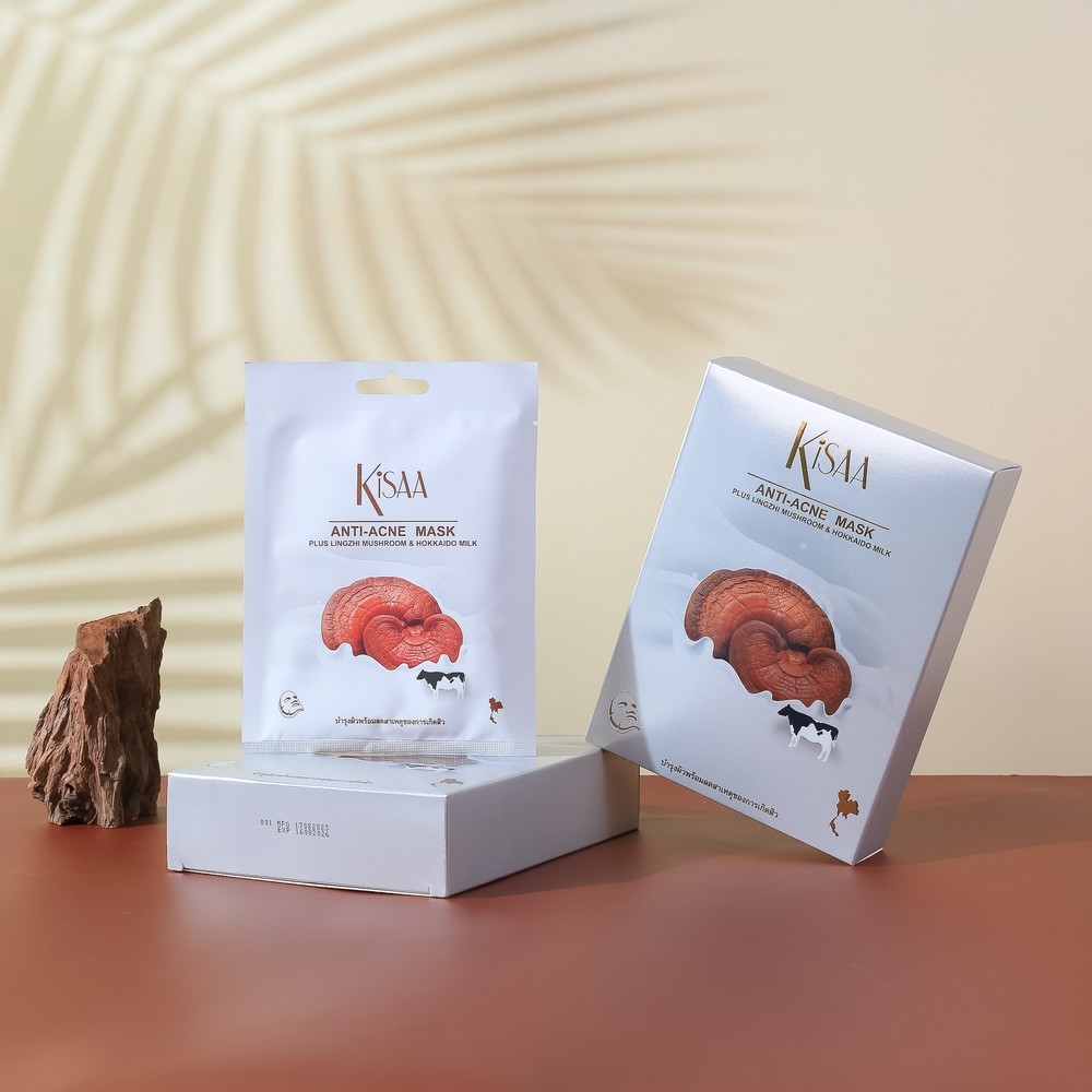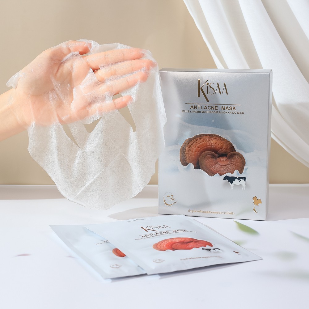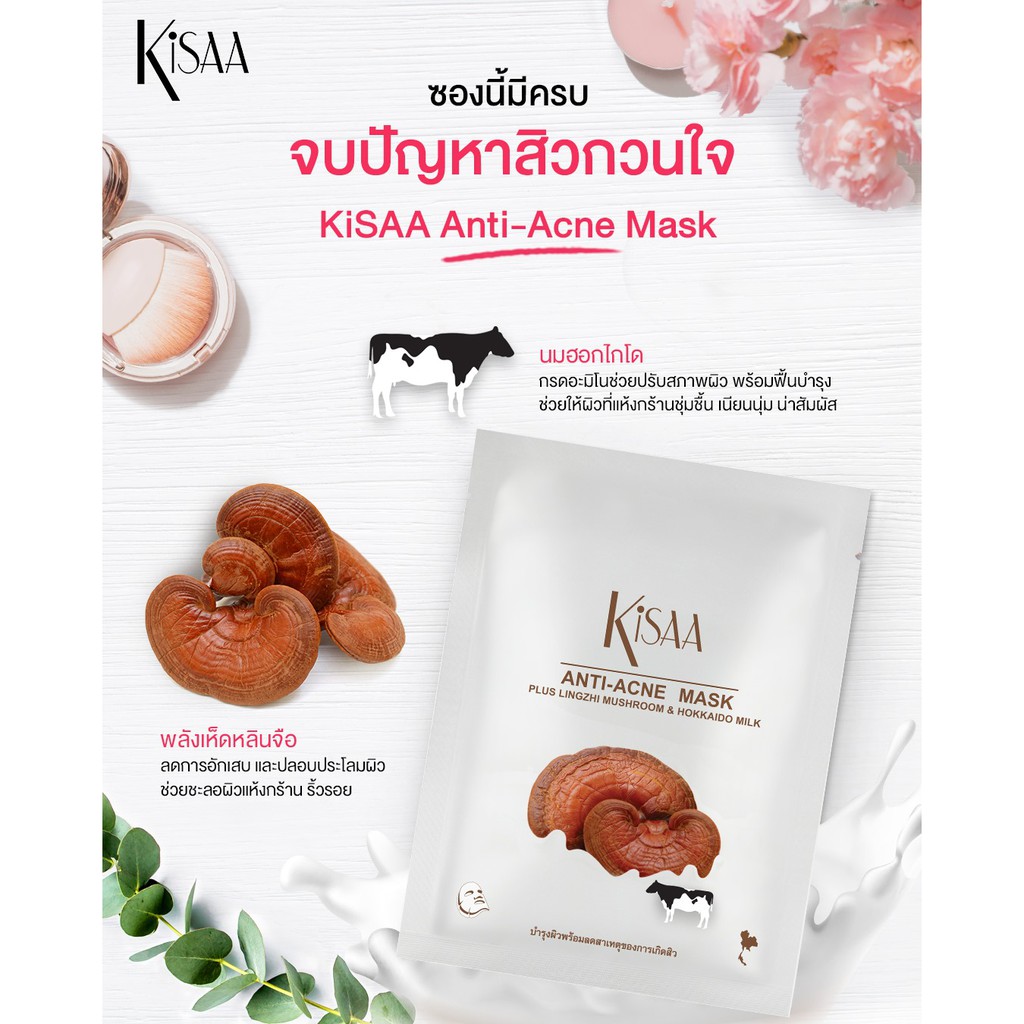 KiSAA มาส์กหน้าเห็ดหลินจือ นมฮอกไกโดและน้ำผึ้ง Anti-Acne Mask ลดสิว บูสผิวใส (กล่อง10 แผ่น)