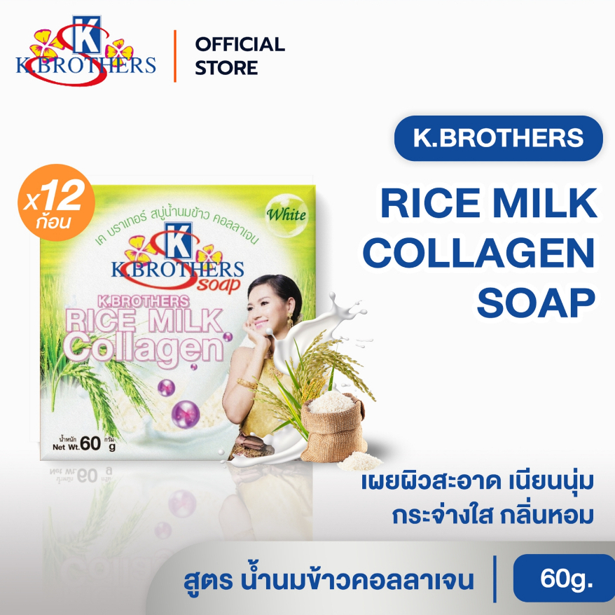 [ 12 ก้อน ] สบู่น้ำนมข้าวคอลลาเจน เคบราเทอร์ K.Brothers Rice Milk & Collagen Soap 60กรัม CODE471