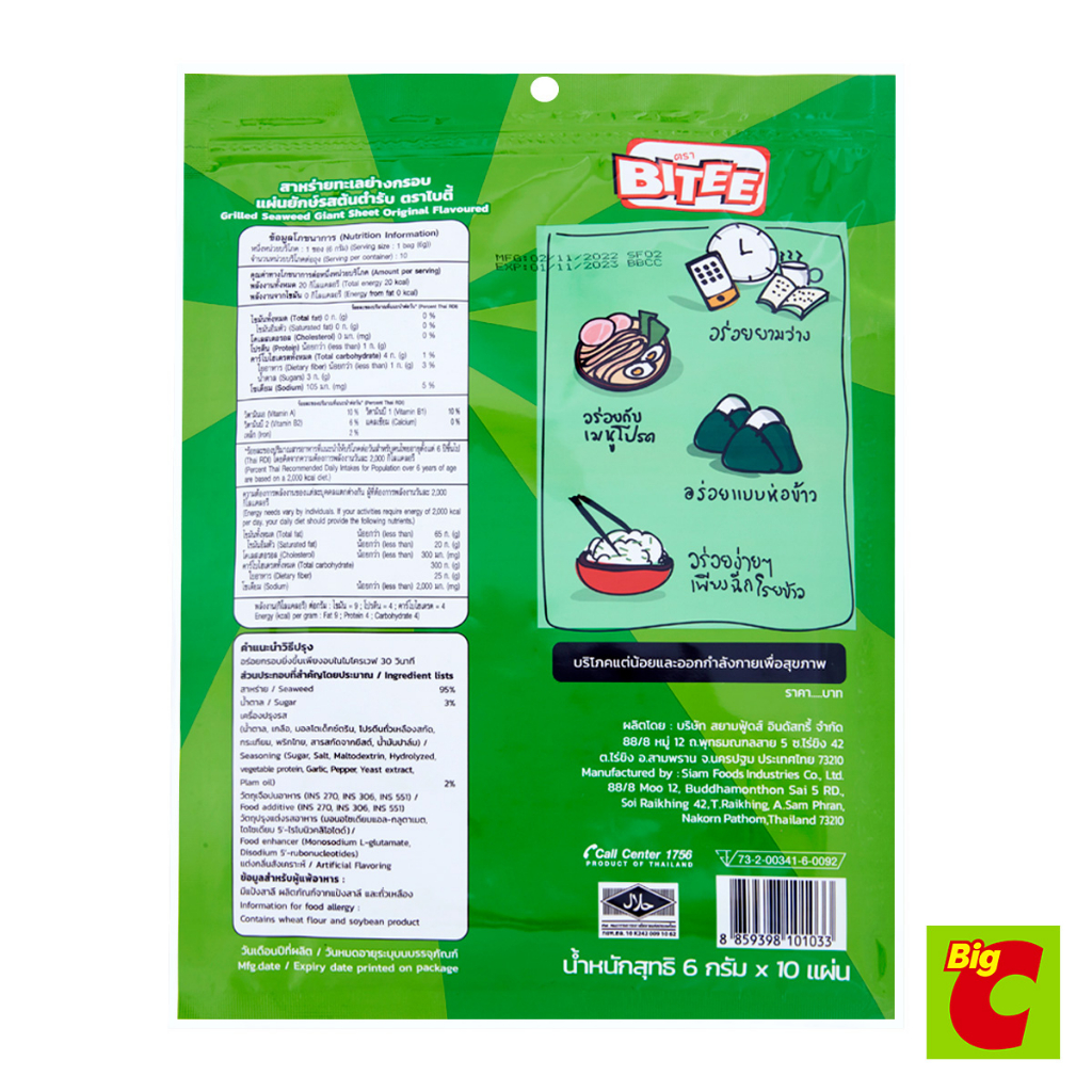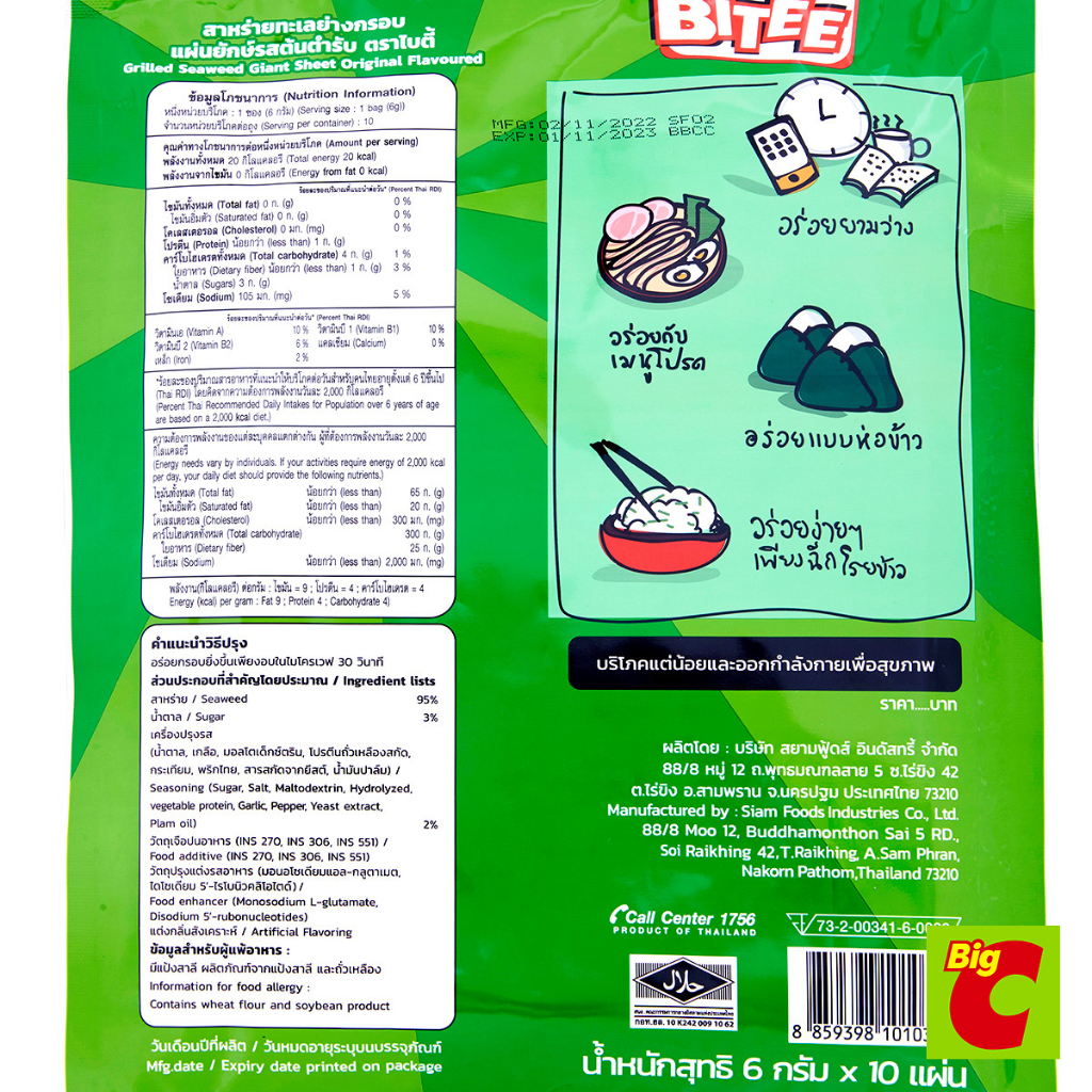 ไบตี้ สาหร่ายทะเลย่างกรอบ แผ่นยักษ์ รสต้นตำรับ 6 ก. 9 แผ่น