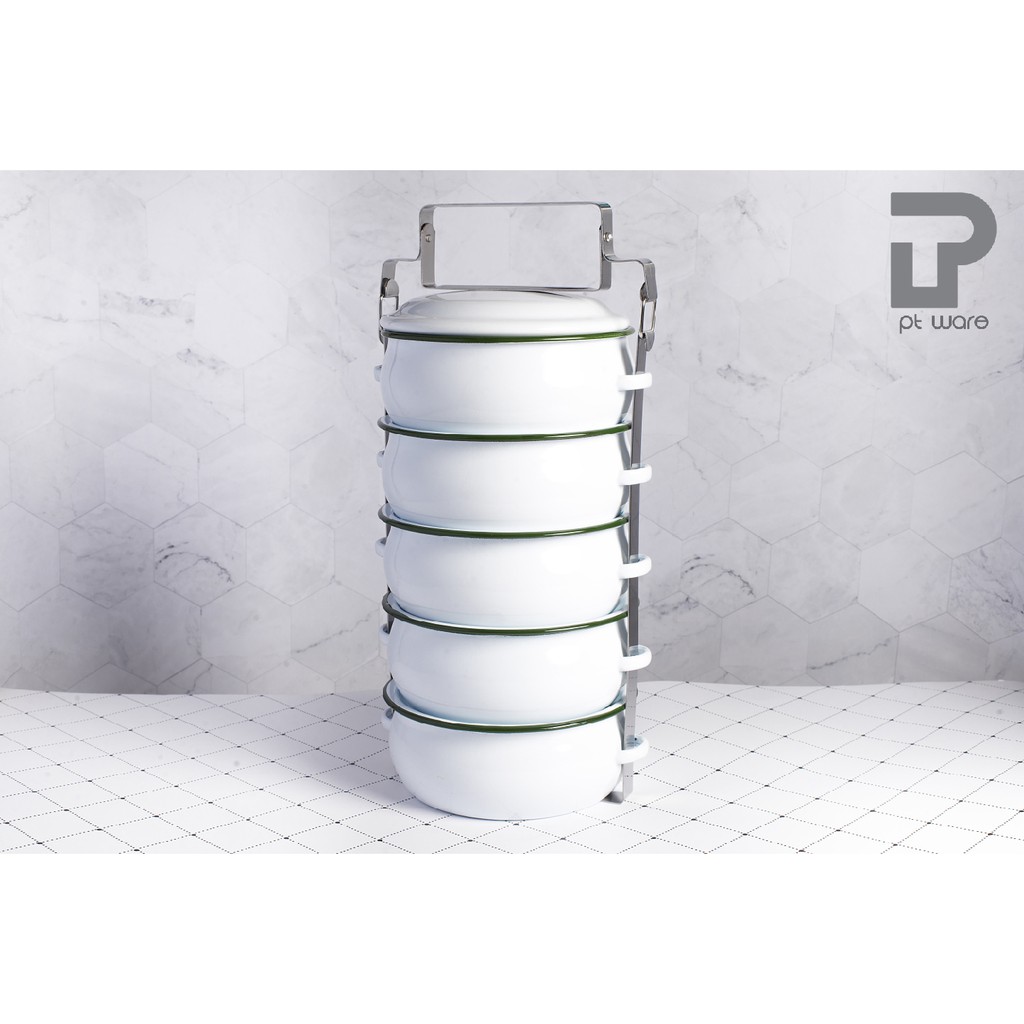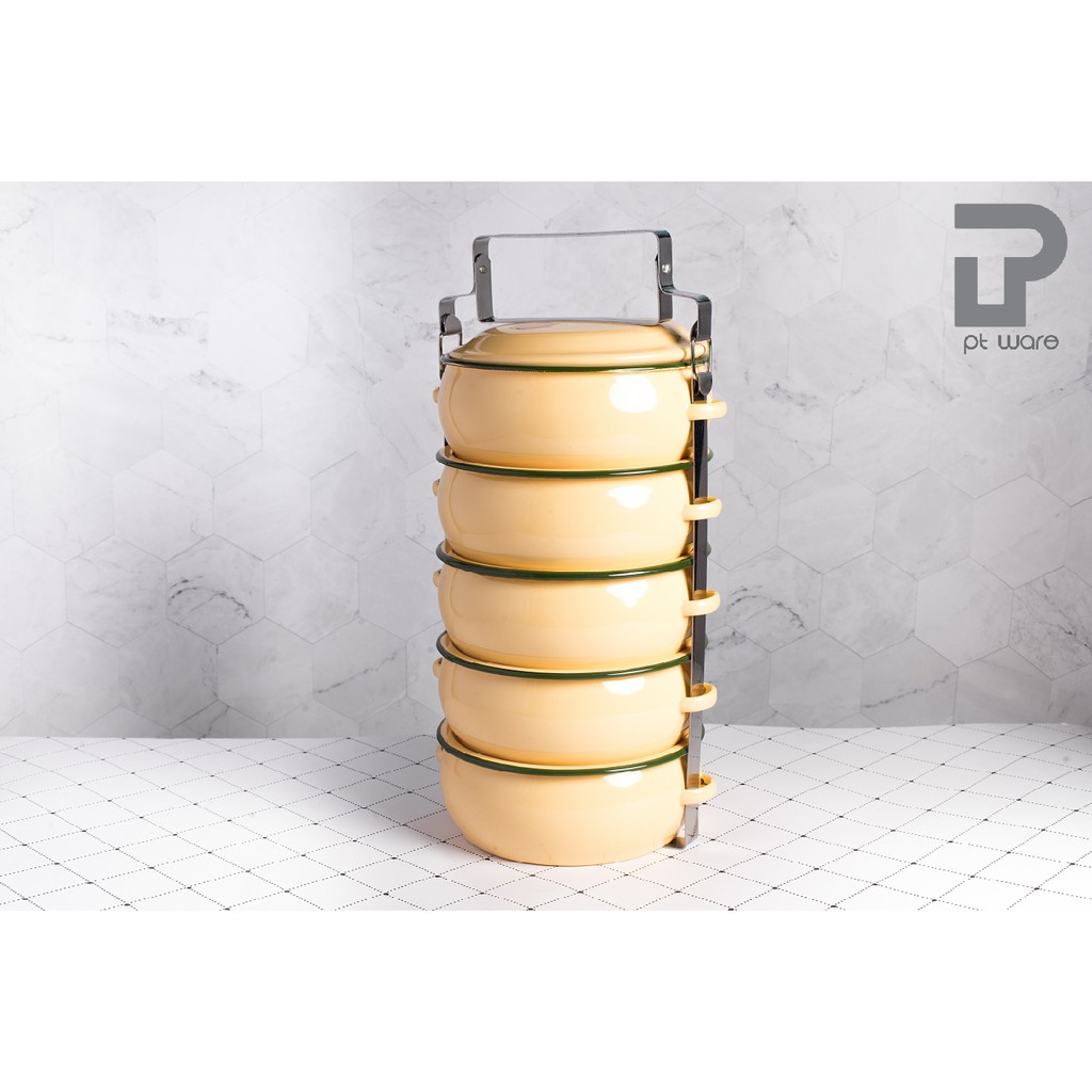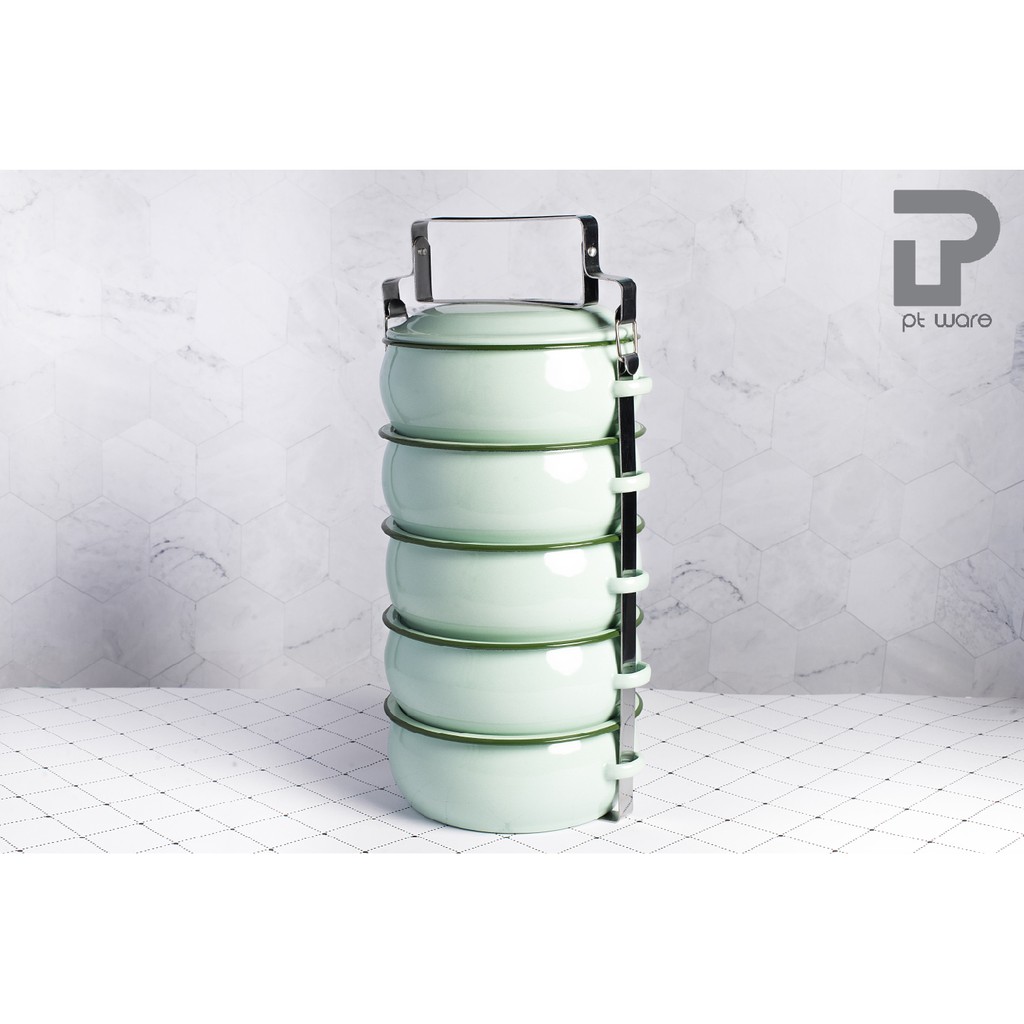 ปิ่นโต ปิ่นโตทรงโอ่ง ปิ่นโตเคลือบ ทรงบุษบา 14cm x 5ชั้น ตรานกเพนกวิน