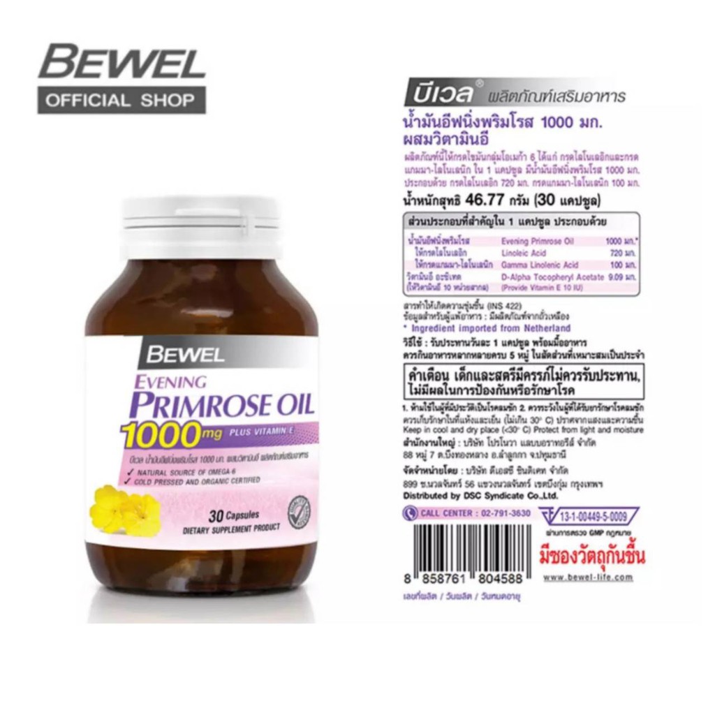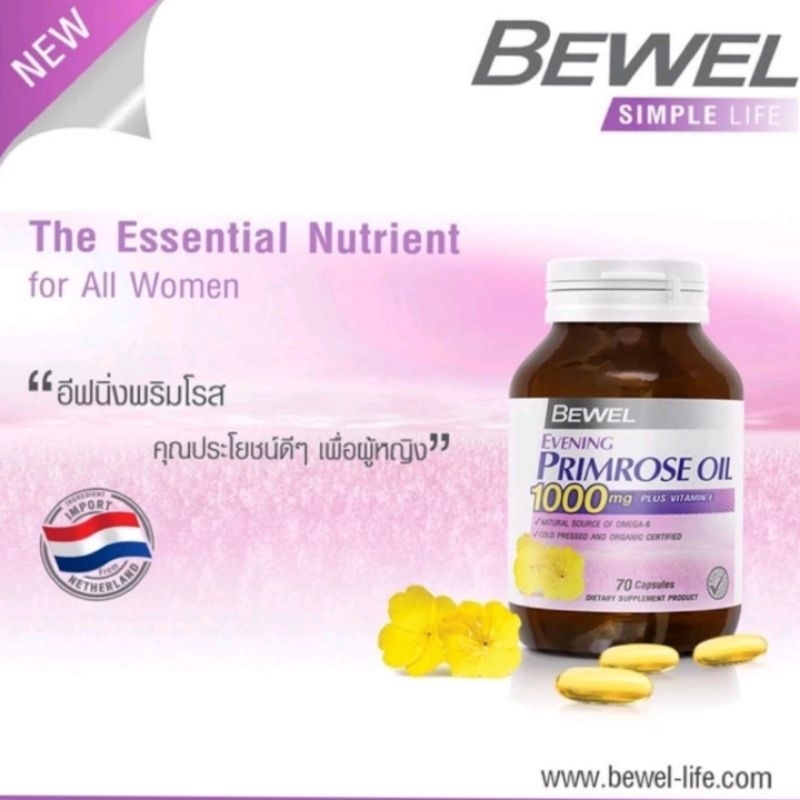 Bewel Evening Primrose Oil 1000mg Plus vitamin E บีเวล อีฟนิ่งพริมโรส ขวด30 เม็ด