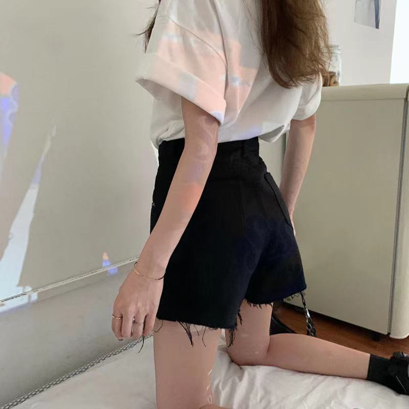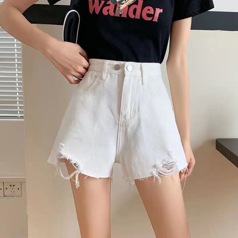 Swan shop แฟชั่นกางเกงยีนส์ขาสั้นเอวสูง ทรงสวยเข้ารูป ปลายรุ่ยขาดขาเล็กน้อย ผ้ายีนส์แท้ สั้นสวมใส่สบาย