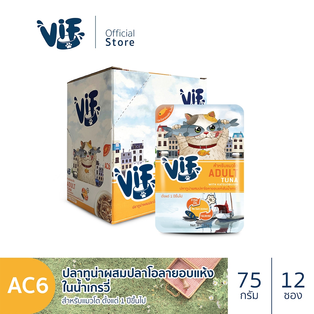 วิฟ (อาหารสำหรับแมว) : C6 ปลาทูน่าผสมปลาโอลายอบแห้งในน้ำเกรวี่ (สำหรับแมวโต)