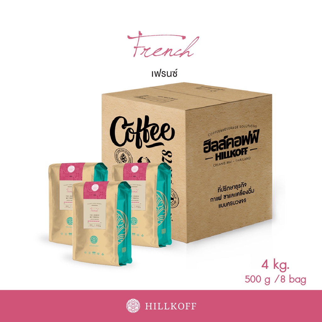 Hillkoff : เมล็ดกาแฟคั่ว อาราบิก้า คั่วเข้ม ฮิลล์คอฟฟ์ (French) Arabica 100% ขนาด 500 g 8 ถุง กาแฟ อราบิก้า เมล็ดกาแฟ