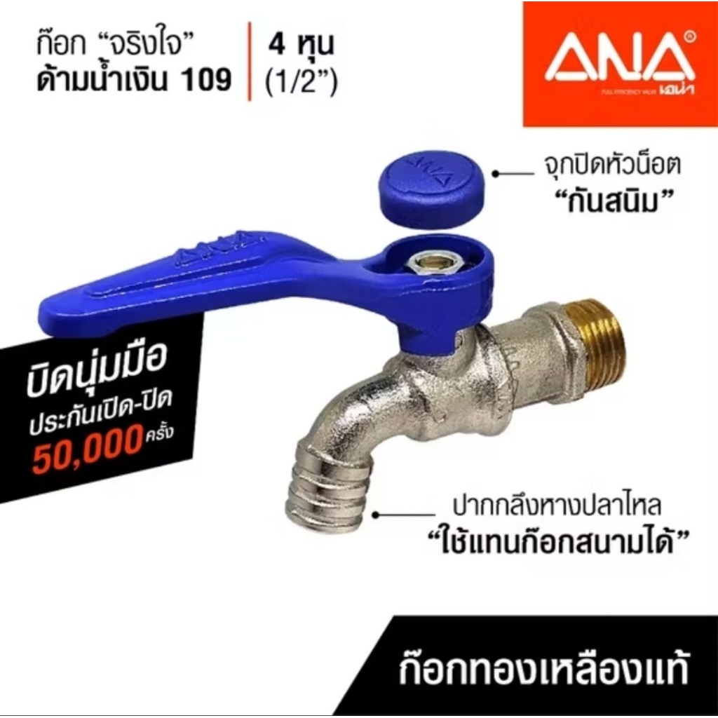 ก๊อกน้ำทองเหลือง รุ่นจริงใจ ANA 4 หุน 1/2" (109) ผลิตในประเทศไทย มี 3 สีให้เลือก ผลิตในประเทศไทย