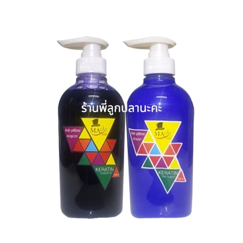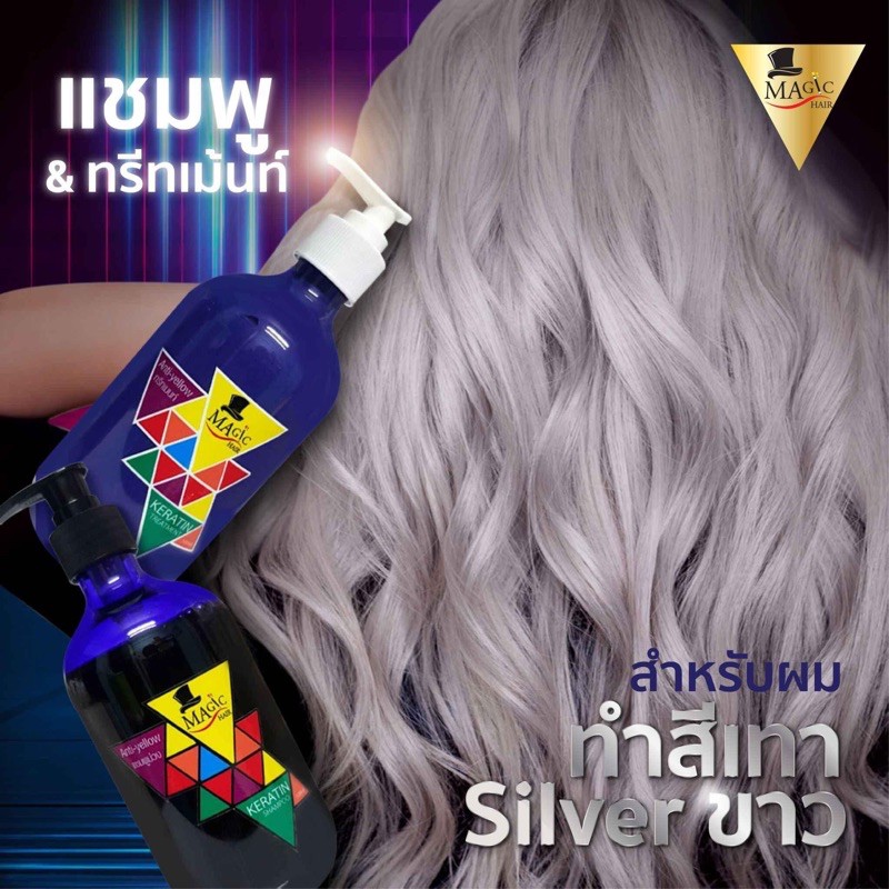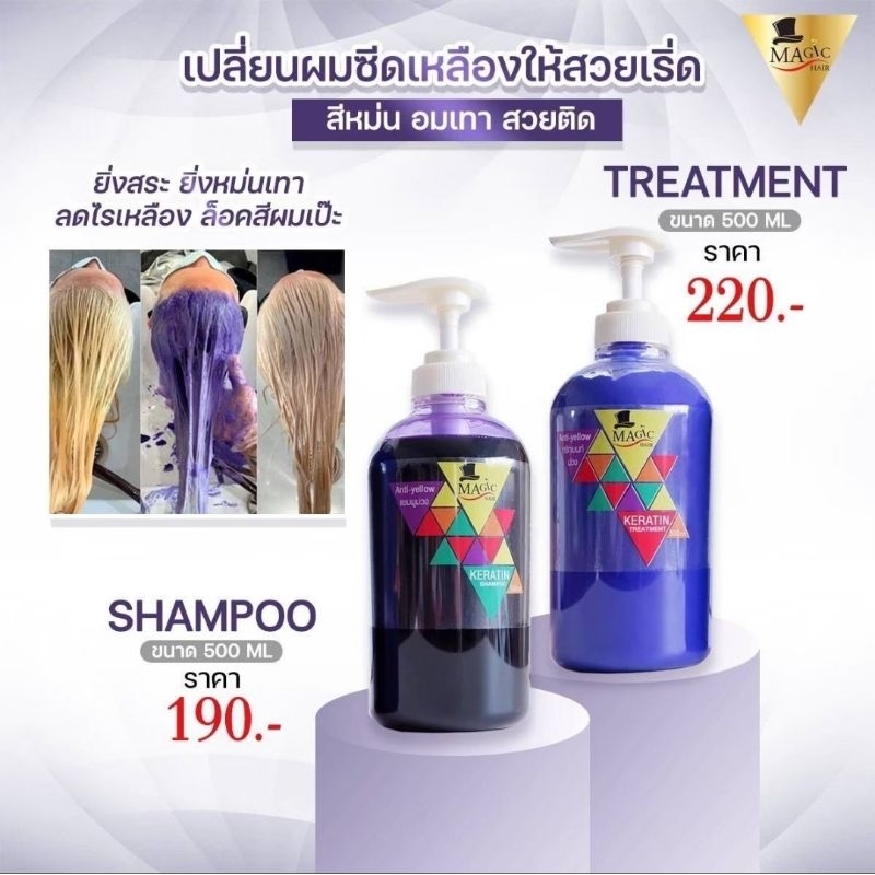 (ครบชุด)แชมพูม่วง500ml.+ครีมนวดม่วง500ml. ครบชุด สำหรับผมฟอกทำสี Magic Hair Anti Yellow Exp : 2028