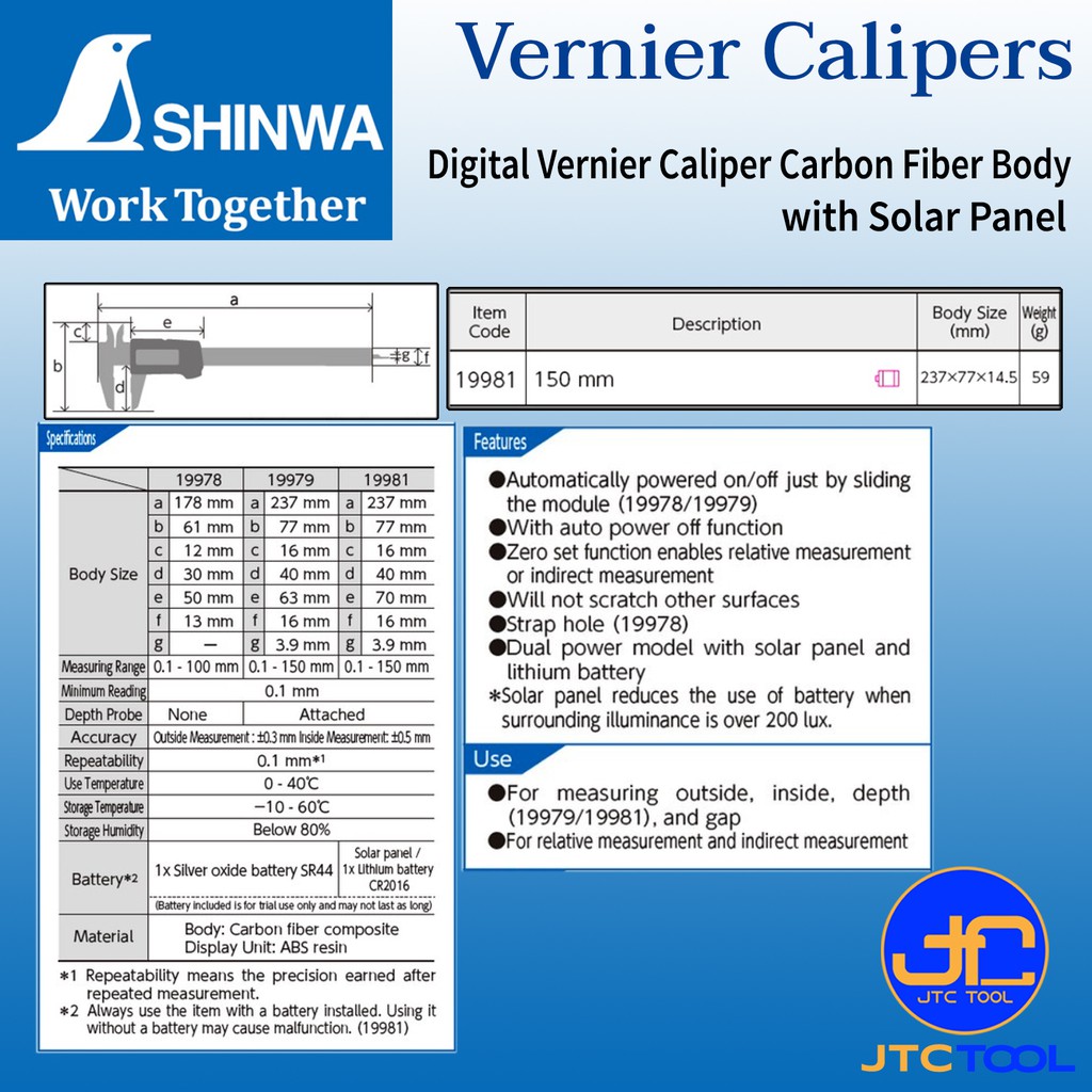 Shinwa เวอร์เนีย คาลิปเปอร์ ดิจิตอลคาร์บอนไฟเบอร์พลังงานแสงอาทิตย์ ขนาด 150มิล รุ่น 19981 - Carbon Fiber Digital Vernier
